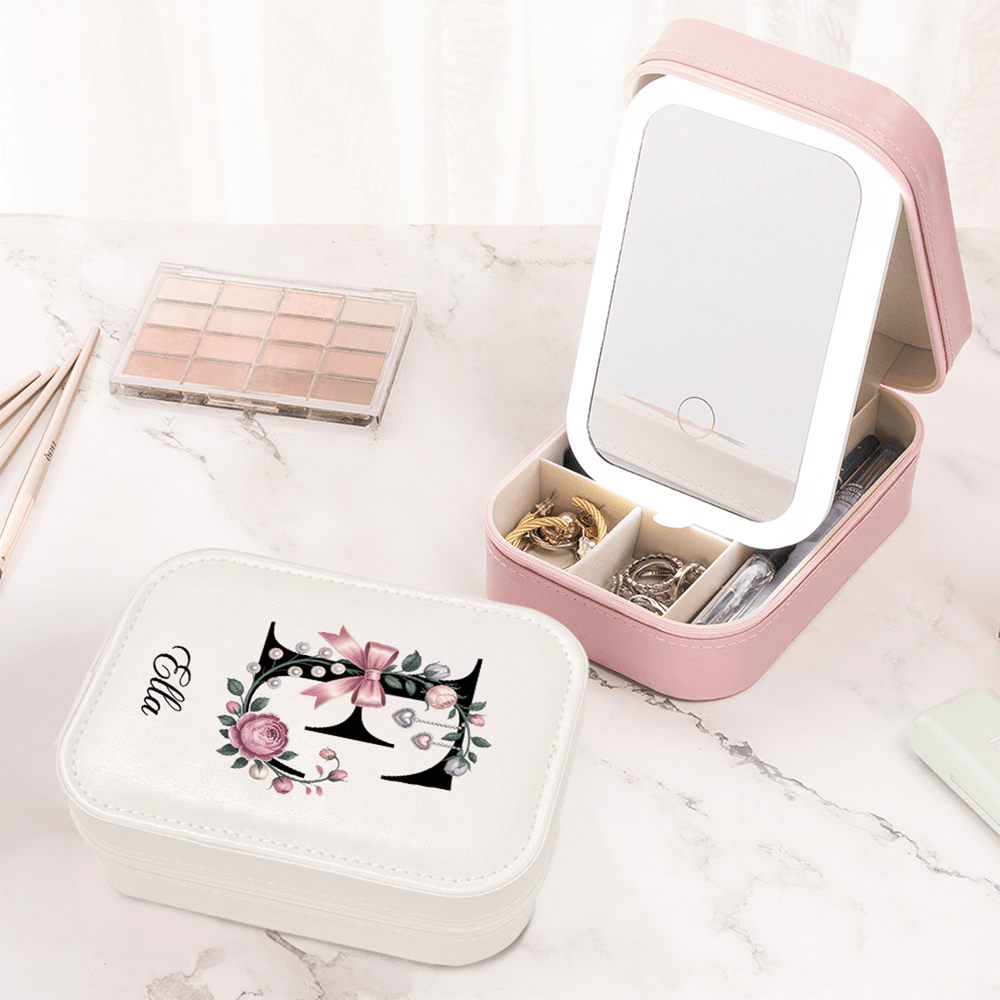 Personalised Elegant Initial Multi-Compartment Name Jewellery Box with LED Makeup Mirror Travel Accessories Birthday Gift for Mom and Grandma
