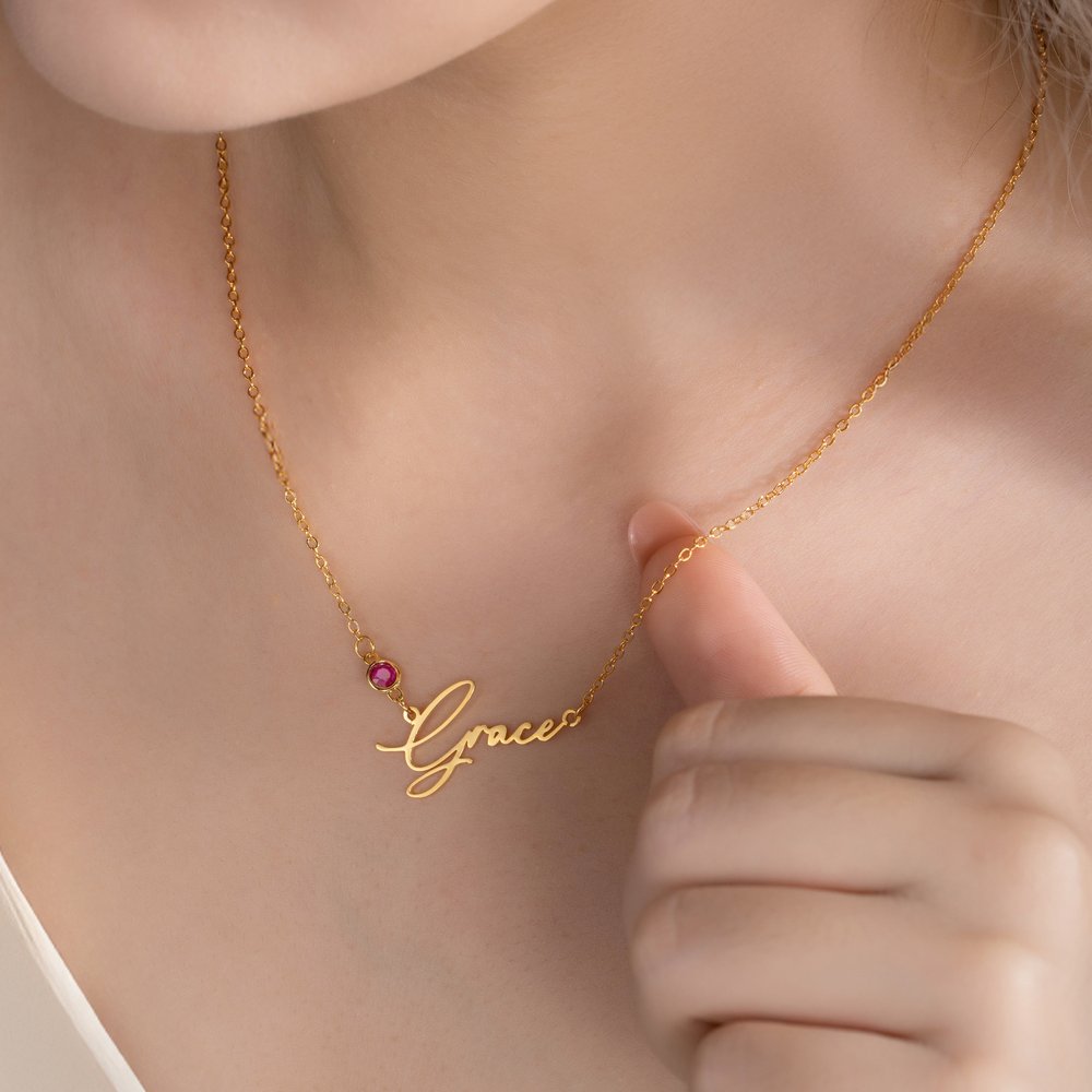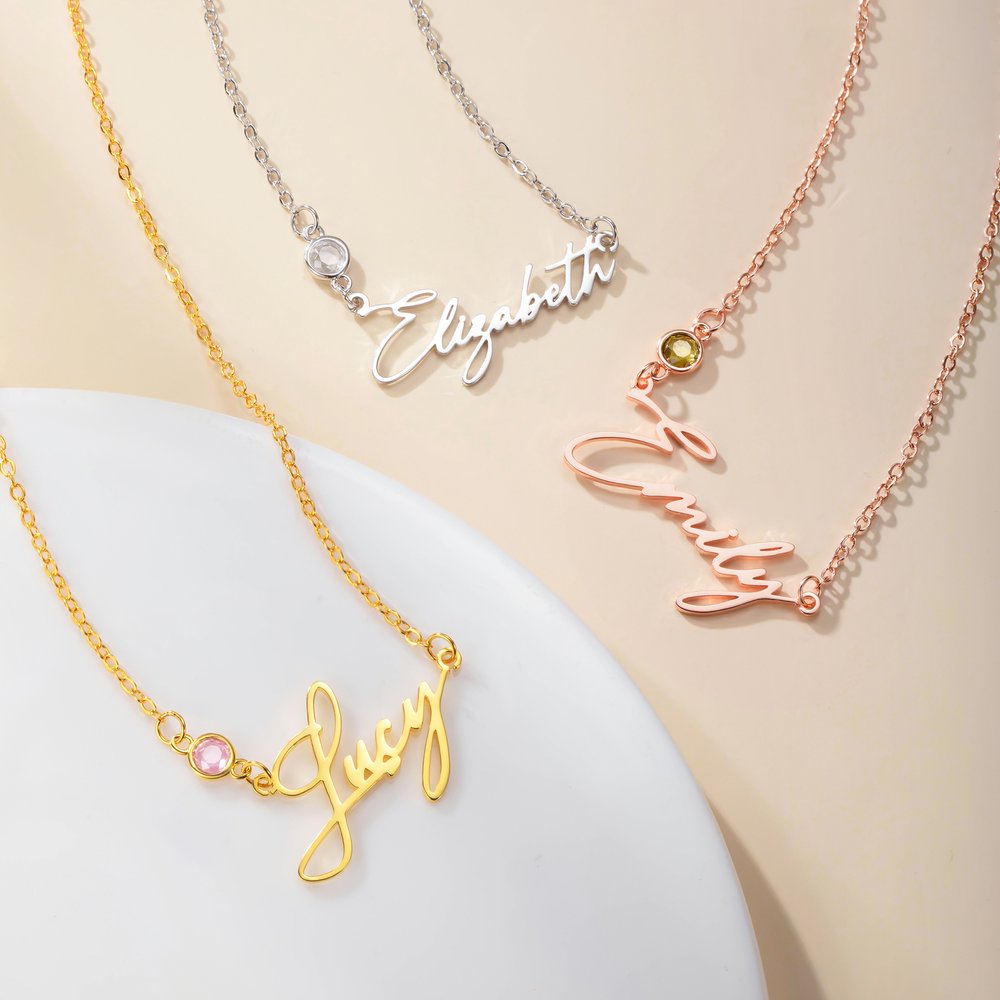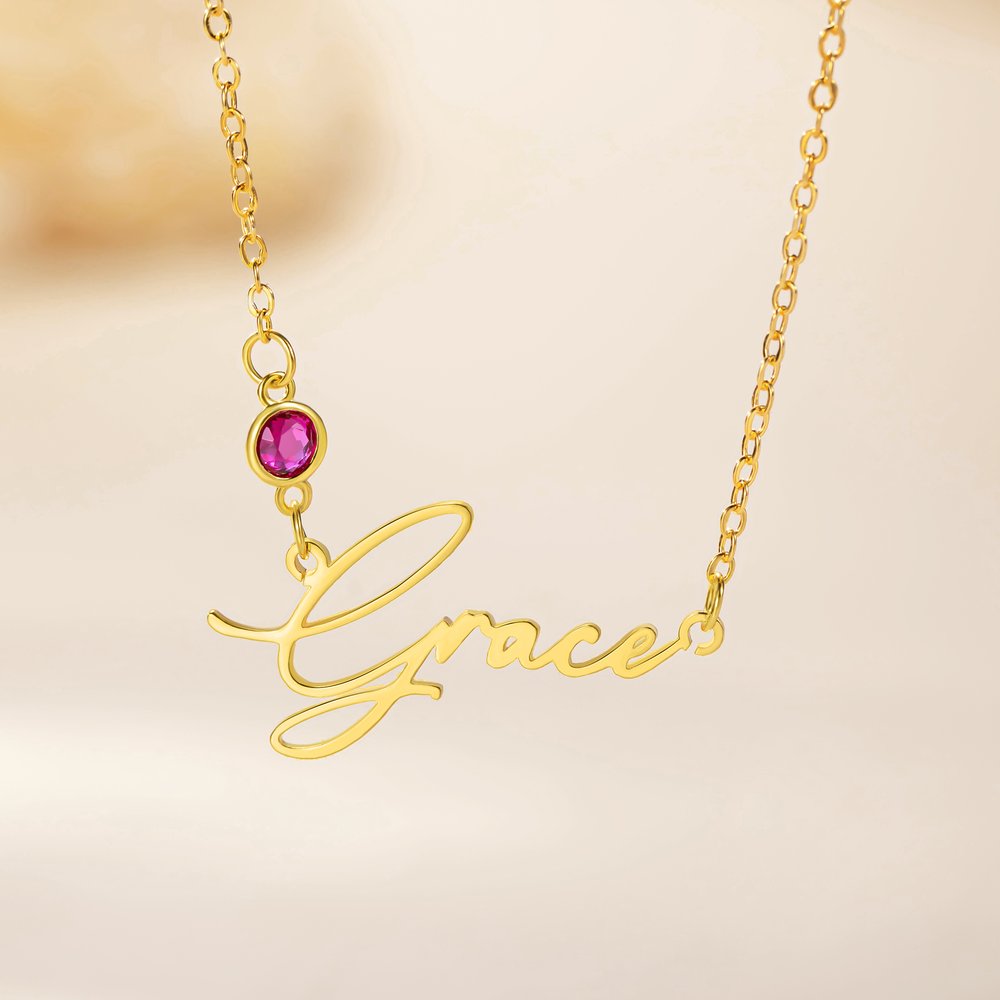 Featuring an elegant and fluid font, the custom name pendant resembles dynamic artistic brushstrokes. You may also select a birthstone representing a meaningful blessing. The harmonious pairing of the birthstone and name not only adds visual depth but also imbues the piece with profound personal significance—transforming it into a distinctive emblem of identity and style.