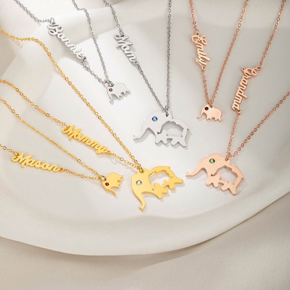Personalised Elephant Mom and Kid Necklace Set with Name and Birthstone Dainty Jewellery Mother’s Day Birthday Gift for Her