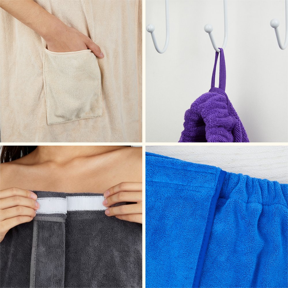 Made from microfiber, it combines softness and high absorbency to ensure you stay comfortable and dry. The Velcro and elastic band design makes it easy to put on and take off, and it fits all body types. Pockets can hold your phone, keys, and other personal items, and the hanging loop is convenient for storage.