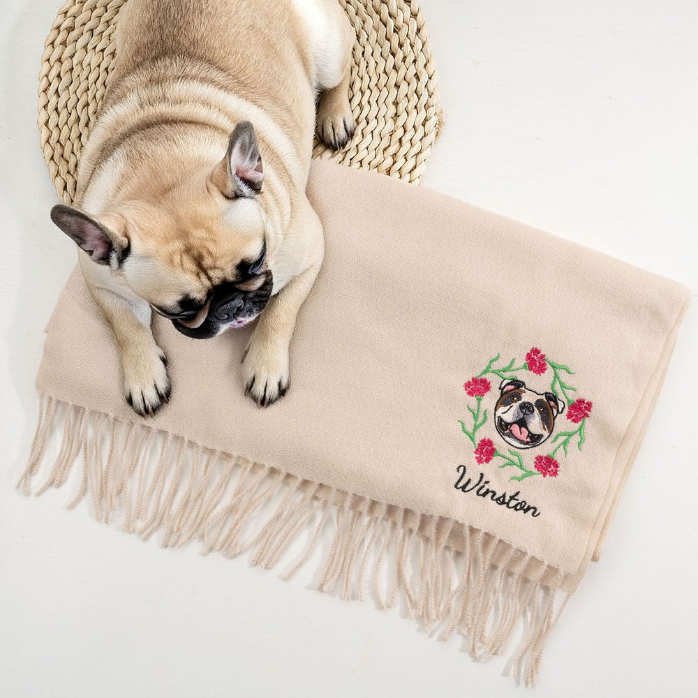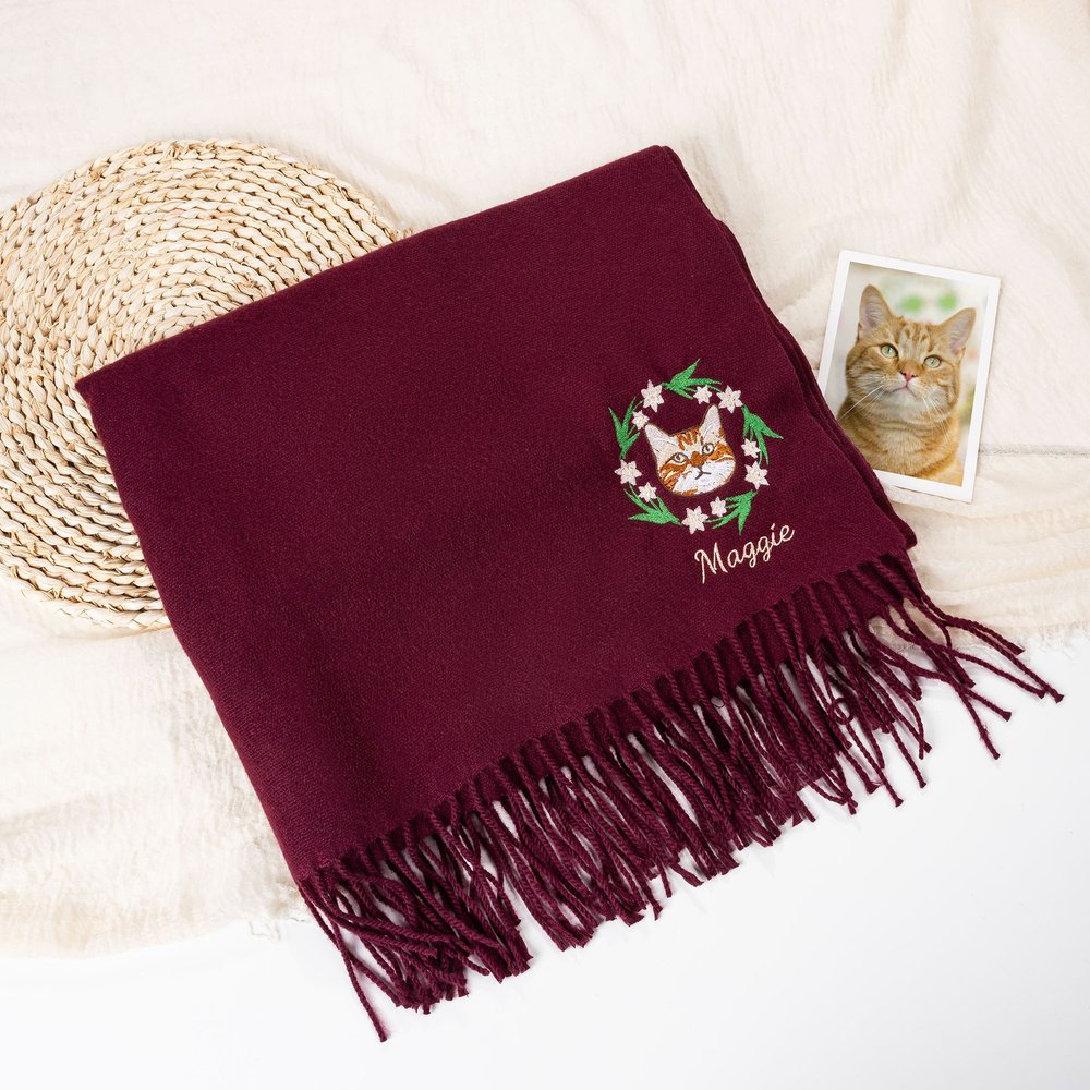 Transform your beloved pet into a warm companion. Through the art of embroidery, we transform your uploaded pet photo into a portrait design, framed by a birthday wreath. Multicoloured embroidery creates simple, vibrant lines that capture your pet's adorable charm. Customizable names create a personal touch, giving each scarf a personal touch.