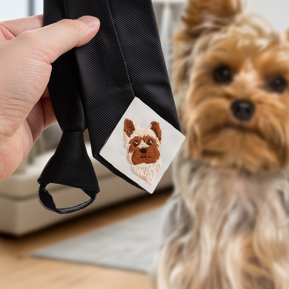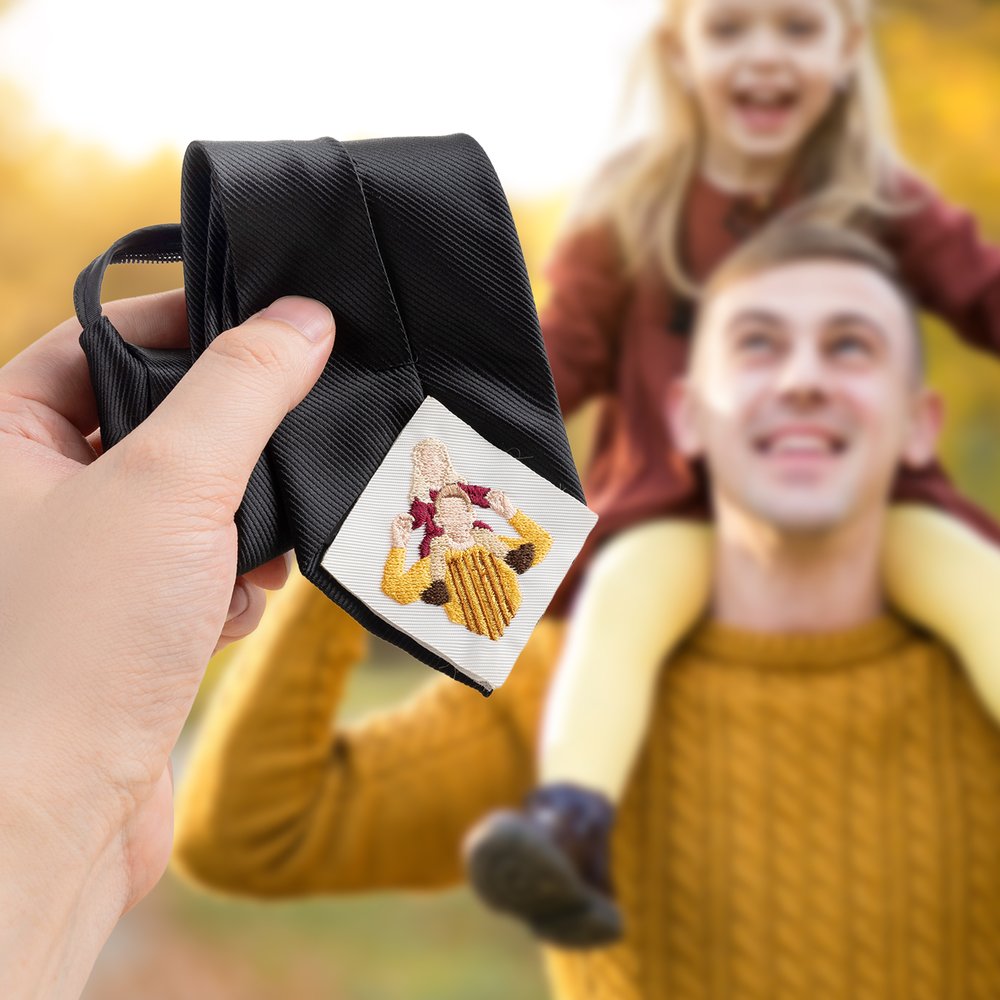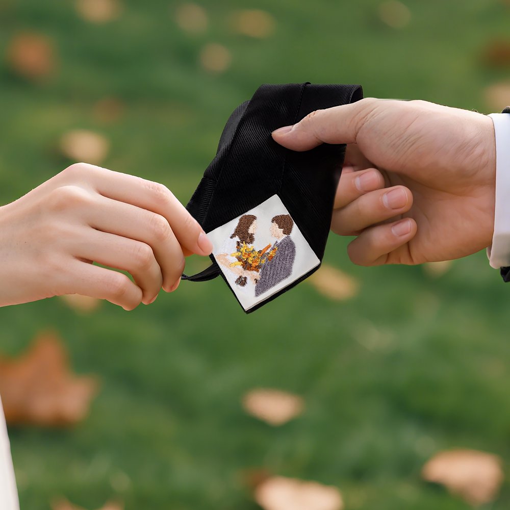 Transform a cherished memory into a work of art. The patch decoration of the tie can be customized with your photo, which is then expertly rendered onto the fabric through elegant embroidery. As a special finishing touch, this decorative embroidered patch is thoughtfully placed on the back, centreed at the bottom, adding a unique and personal detail known only to the wearer.