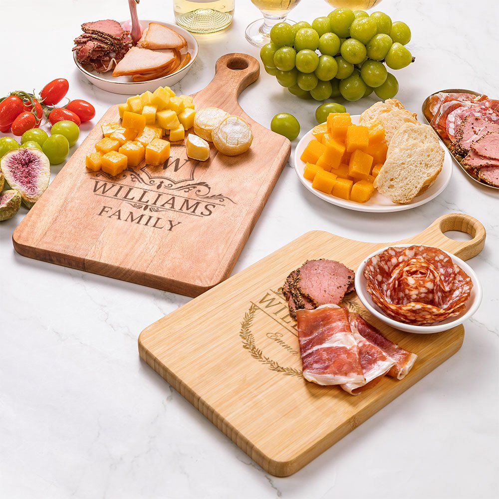 This chopping board features a special monogram design that allows you to engrave specific names and initials to suit your needs. There are three simple design styles for you to choose from. The wood grain background makes the chopping board look more rustic and natural.