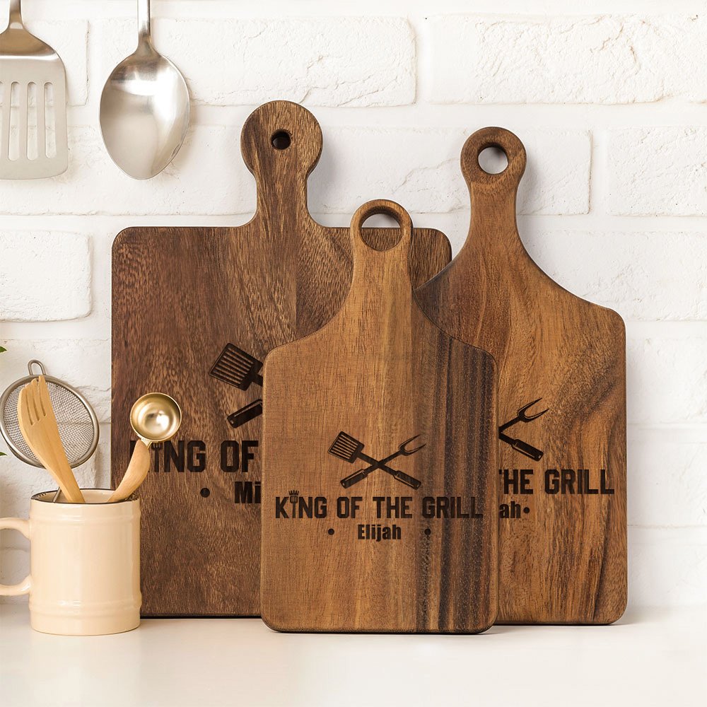 This deli chopping board stands out with its spatula and fork graphic design features. In addition to its useful cutting capabilities, it is also artistic. Not only does it have a fixed text of "King of the grill", but it can also be customized with a unique name. The chopping board retains the natural colour and texture of the wood. Four different materials and colours of walnut, bamboo, mahogany, and cherry wood enrich your choices.