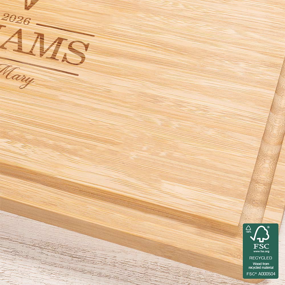 Crafted from FSC-certified bamboo, this board balances durability, eco-friendliness, and elegance. The bamboo material is sturdy and resistant to wear, while its natural grain adds a warm, organic touch. It’s easy to clean, and the juice groove edge minimizes mess during food prep—blending practicality with sustainable quality.