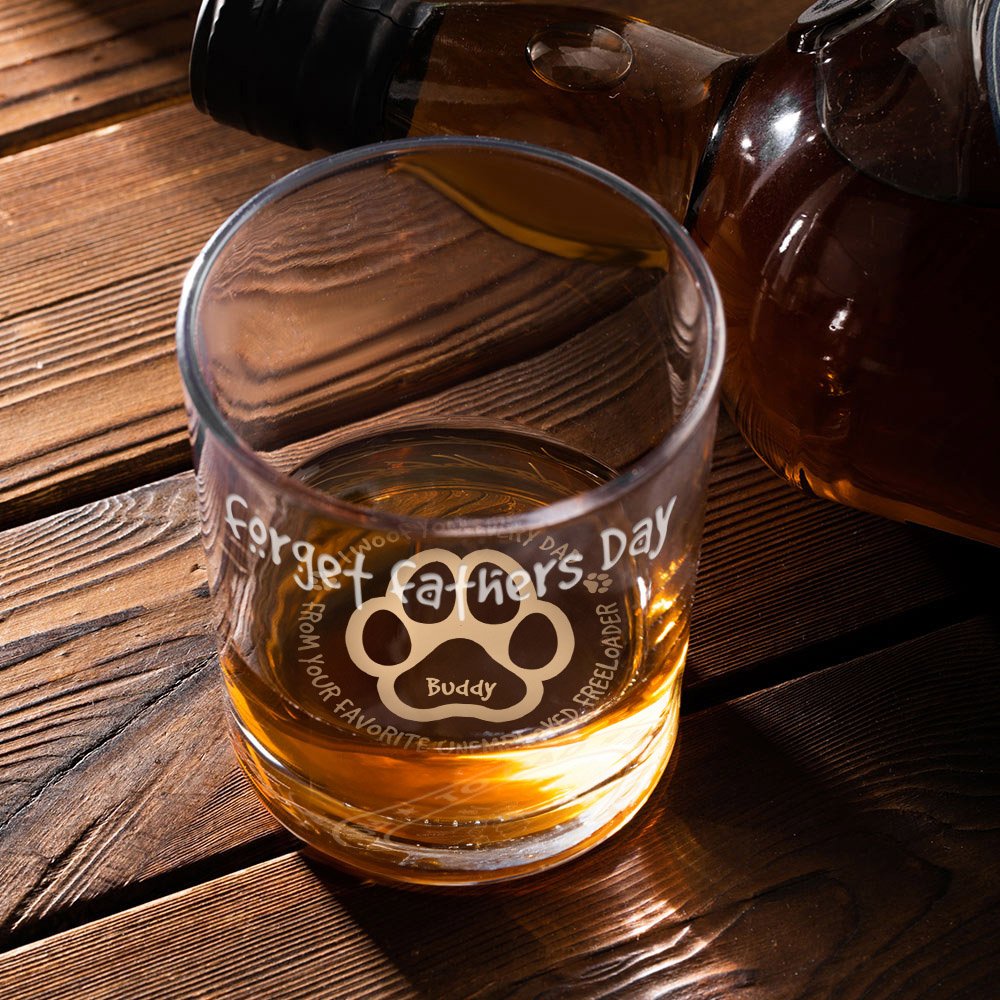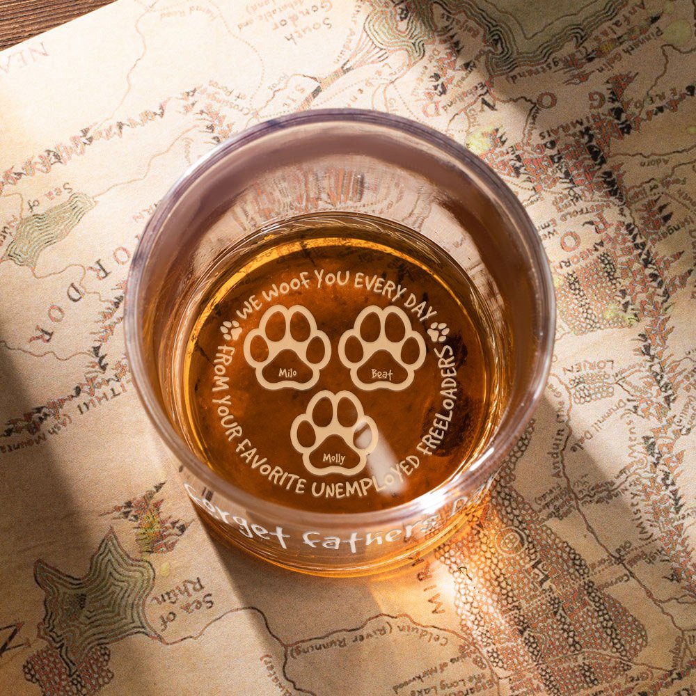 Celebrate dog dad with a playful twist! This whisky glass features the fixed text, "Forget Fathers Day, we/I woof you every day, from your favorite unemployed freeloader/freeloaders." Customize the glass with 1-5 dog's name to make it unique. It's a lighthearted way to express love and appreciation, perfect for any dog-loving.