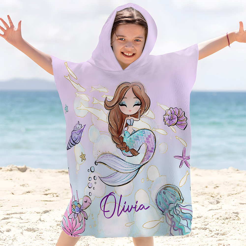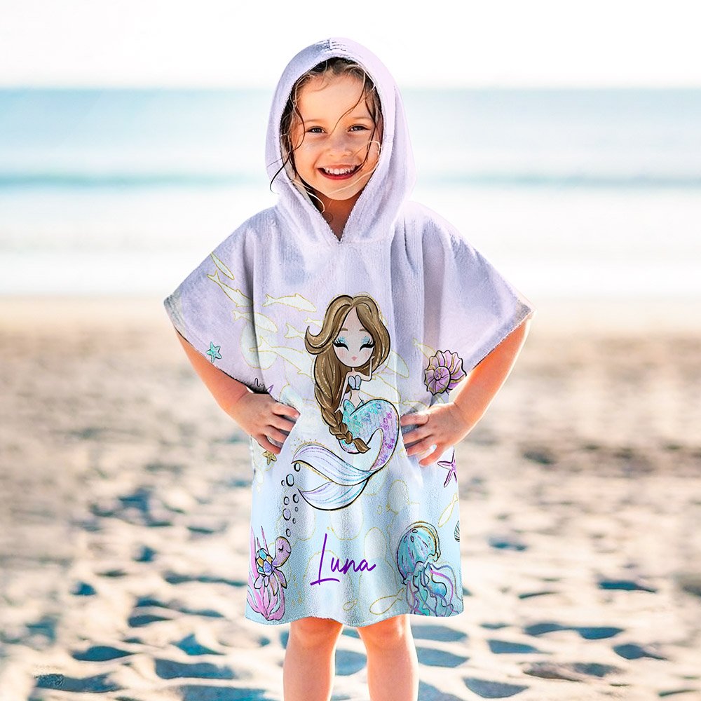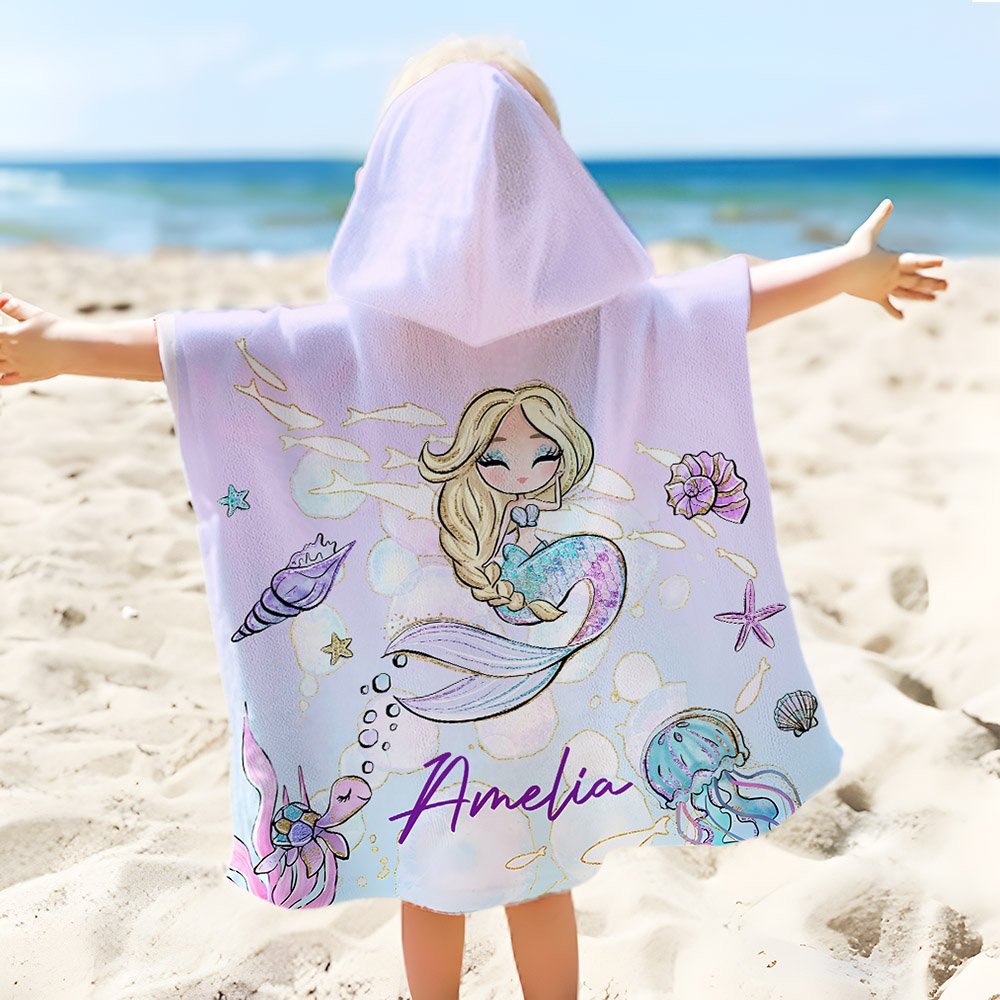 Adorned with an enchanting fantasy mermaid design, symbols of mystery, freedom, and the allure of the ocean have long captivated the human imagination. Transform your kid's beach and pool escapades into unforgettable memories with our one-of-a-kind hooded beach towel, which can be Personalised with your child's name.