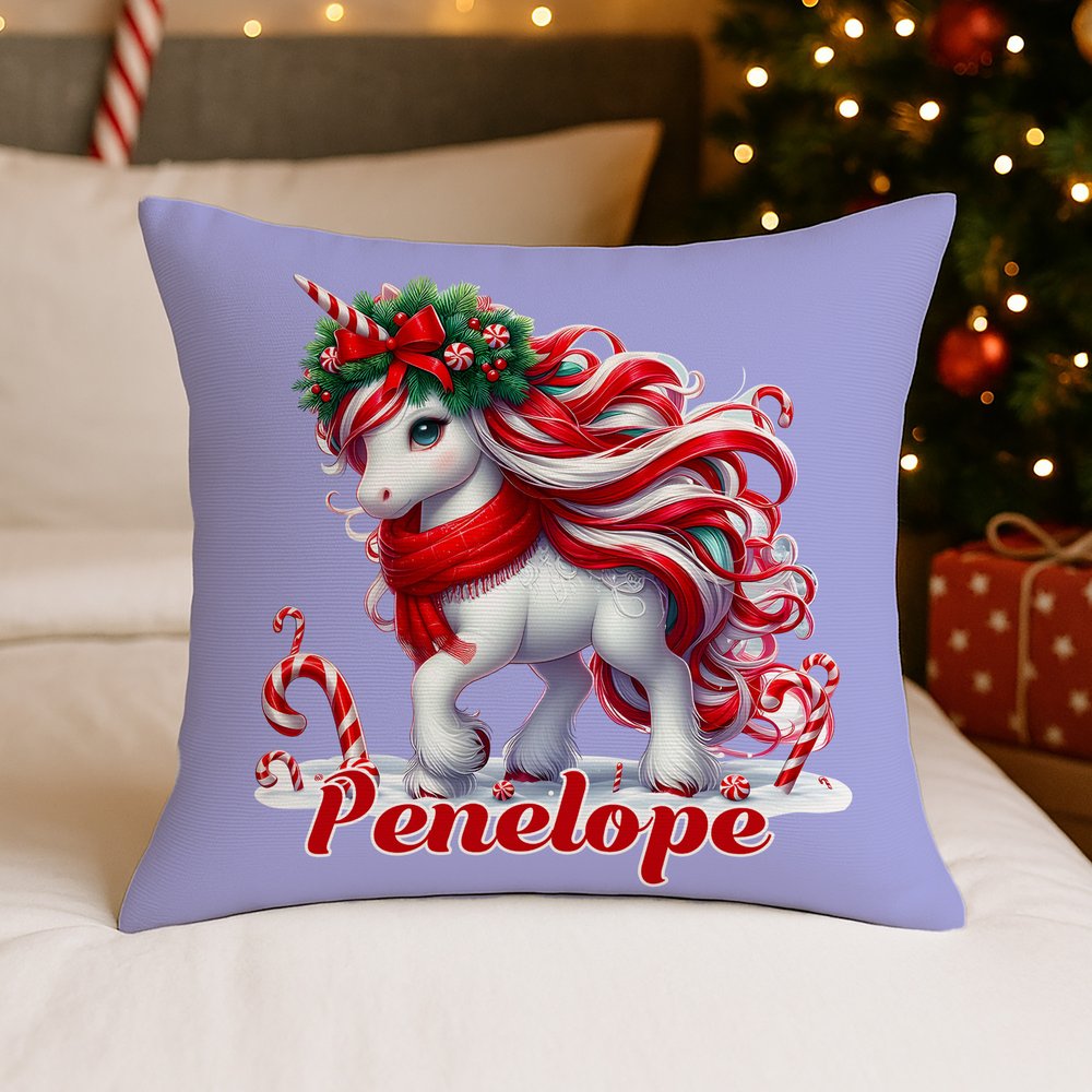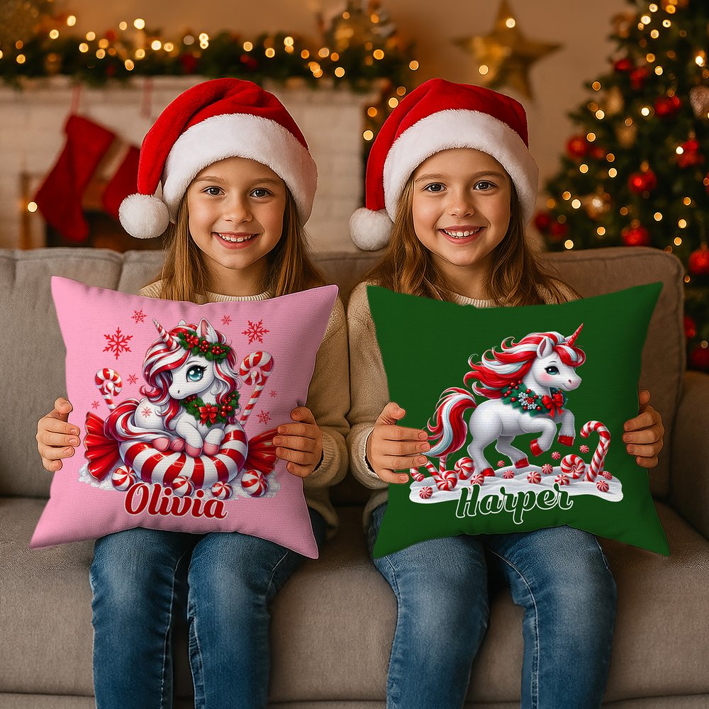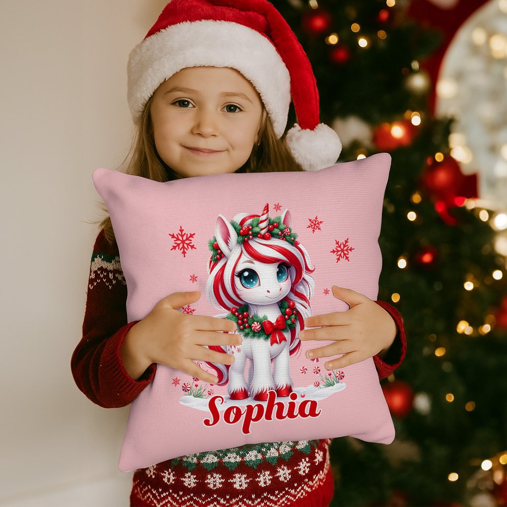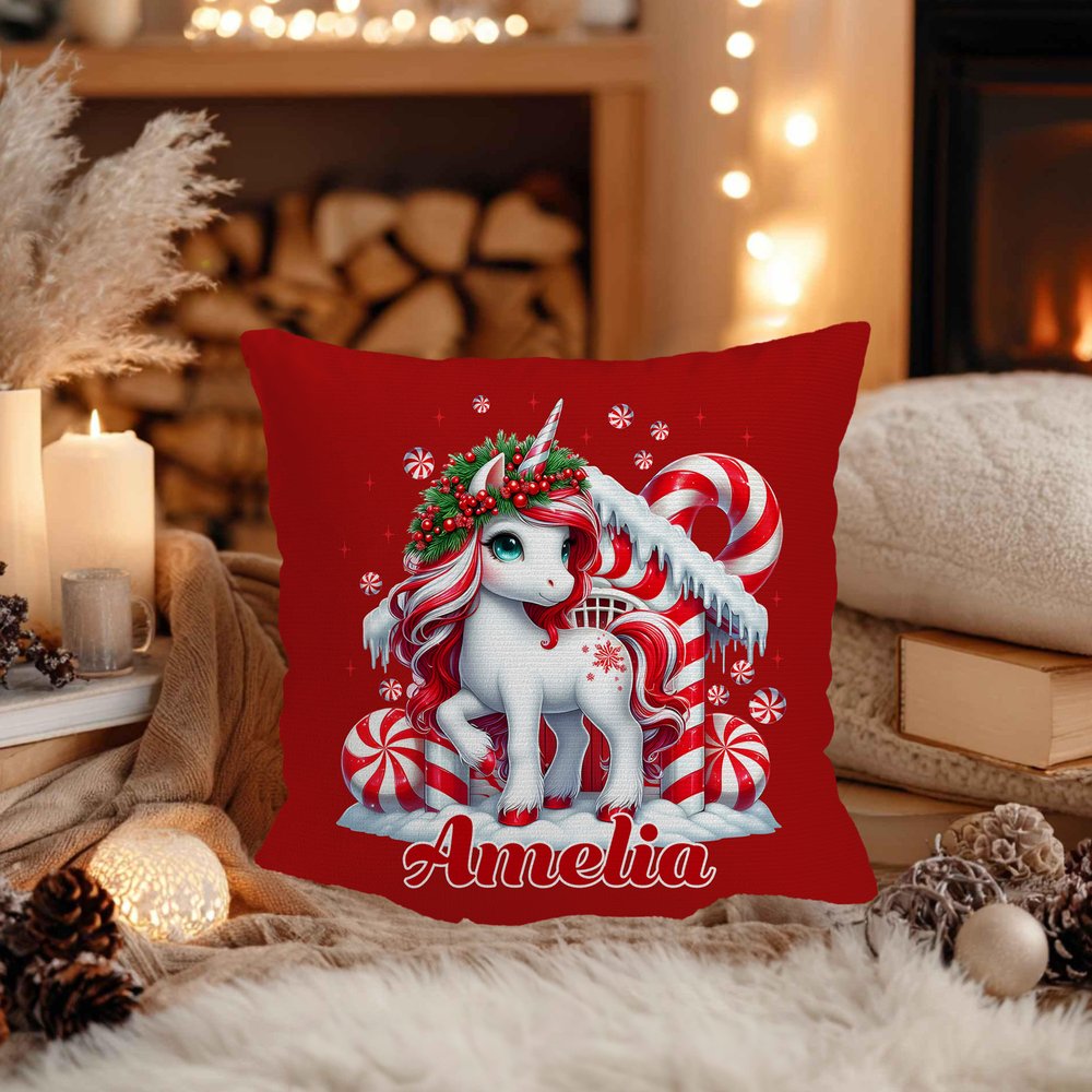 This pillow cover stands out with its attractive design, featuring a cartoon Christmas fantasy unicorn as the central element, paired with classic Christmas elements such as lively snowflakes and adorable Sweets canes, creating a rich, festive atmosphere and a romantic feel. You can even print your child's name on the pillow cover, easily adding a unique Christmas touch to your space.