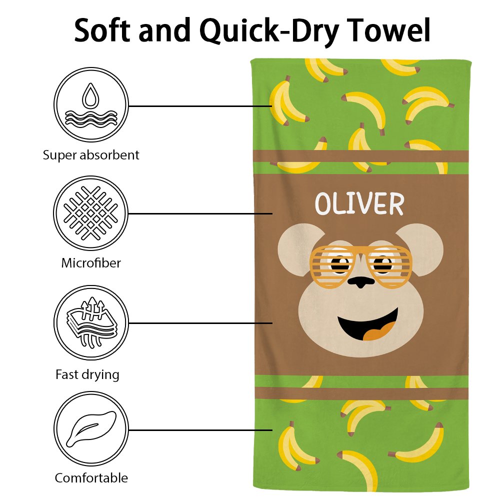 The design of this beach towel is full of childishness and creativity. We provide four different cute animal patterns for you to choose from: dog, fox, monkey, and fantasy unicorn. Each pattern is colourful, vivid, and interesting. You can also customize your child's name, which will make your child feel that this gift is unique and exclusive.