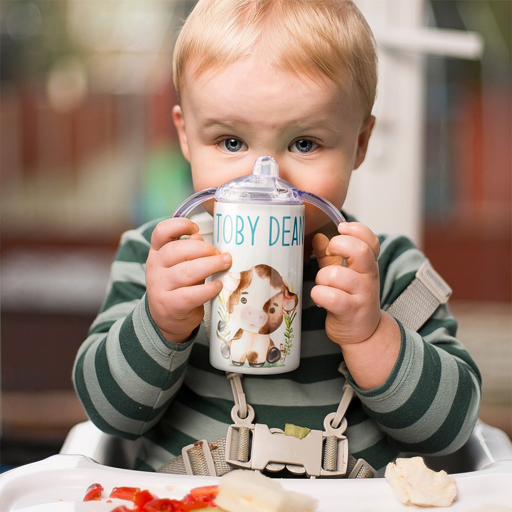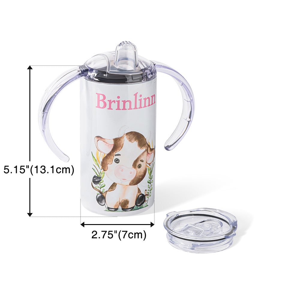 This adorable sippy cup features a charming farm cow design, making it a delightful and engaging choice for toddlers and kids, and you can make this sippy cup extra special by personalizing it with the child's name.