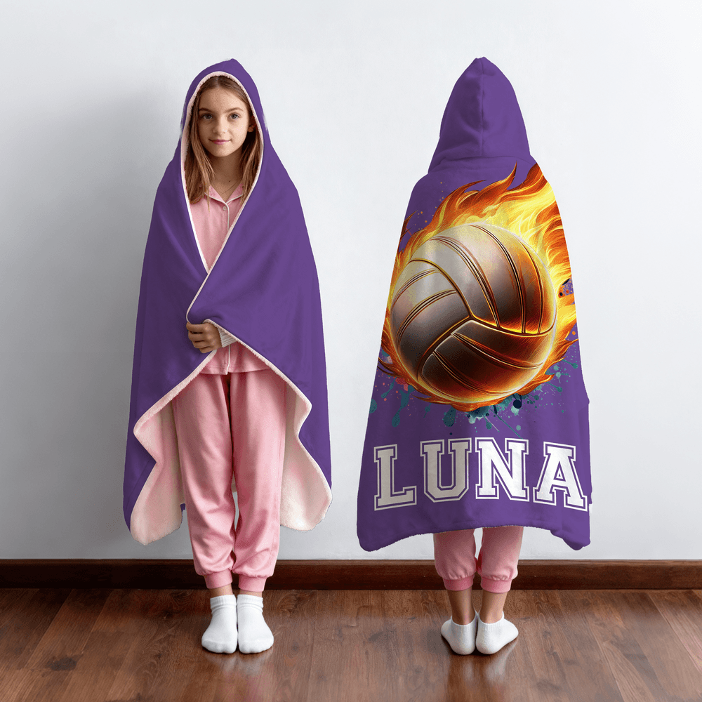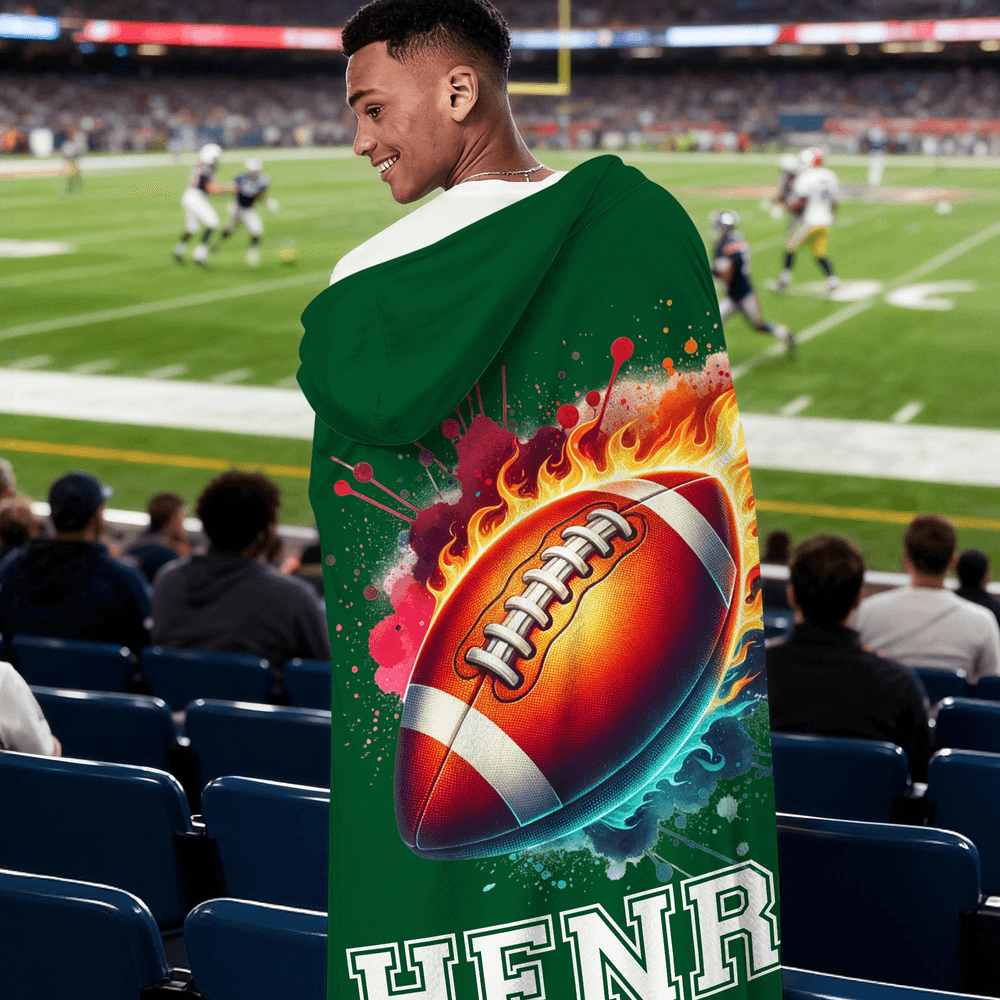 This hooded blanket features a dynamic sports flame theme, with 11 vibrant flame ball patterns to choose from. Personalise it with a name and number to blend athletic spirit with individual identity. The hooded design combines functionality and style, transforming the blanket into a wearable statement of passion. Each piece serves as a personalised emblem for sports enthusiasts, turning their love for movement into a cozy, everyday companion.
