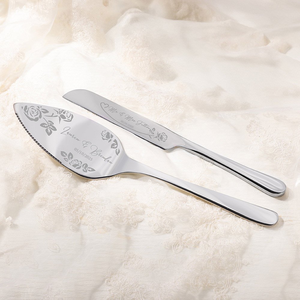 With its exquisite floral design and elegant appearance, this cake-cutting set perfectly matches the romantic atmosphere of the wedding. The sets are decorated with delicate floral patterns, symbolizing love and purity, adding a unique beauty to the wedding. Custom names and dates are supported on the cake-cutting set to make it more memorable.