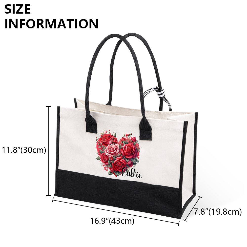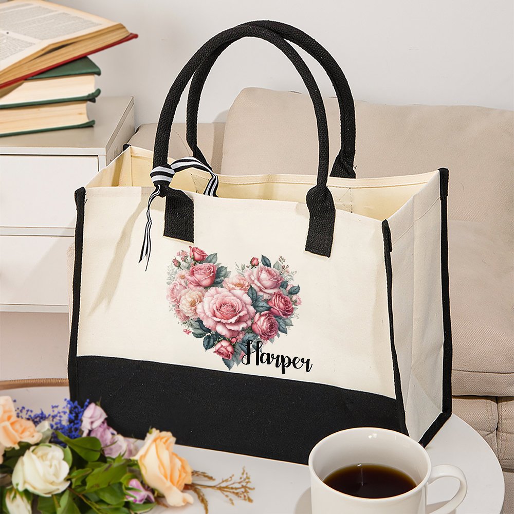 This canvas tote bag features a beautiful floral heart pattern, and 20 heart flowers to choose from, customizable with your name. The intricate pattern adds an elegant and personal touch, making this tote not only a practical accessory but also a meaningful gift.