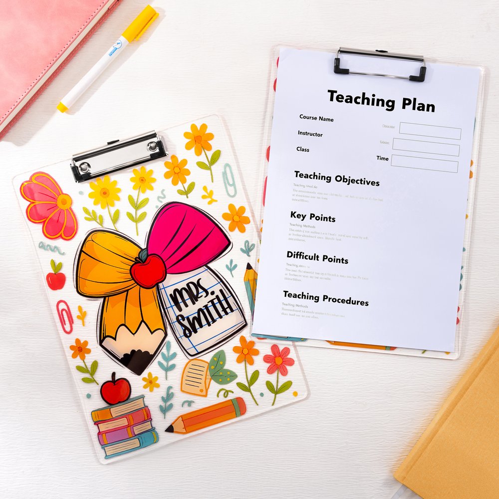 This clipboard combines elements such as cute pencils, bows, apples, books, flowers, and paper clips, and features a customizable name. You can also choose single-sided or double-sided printing to make it unique, adding a touch of colour to your daily teaching.