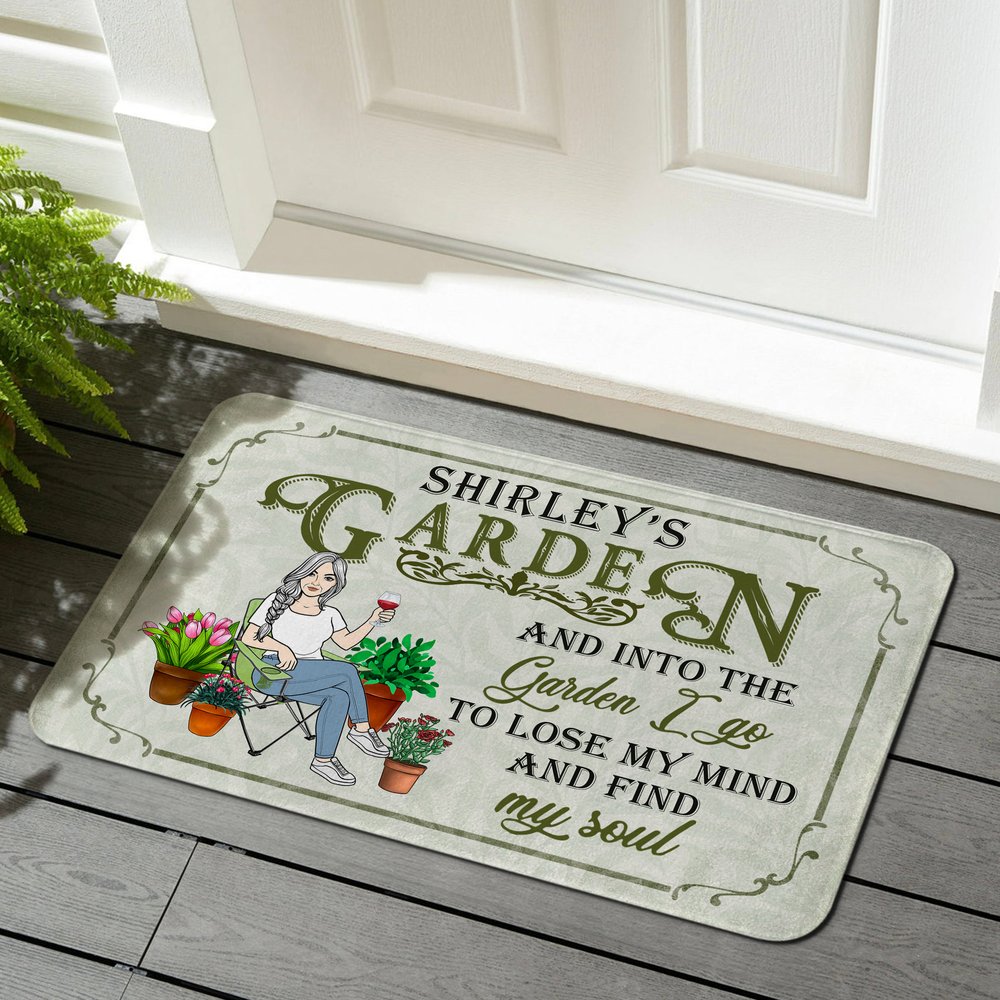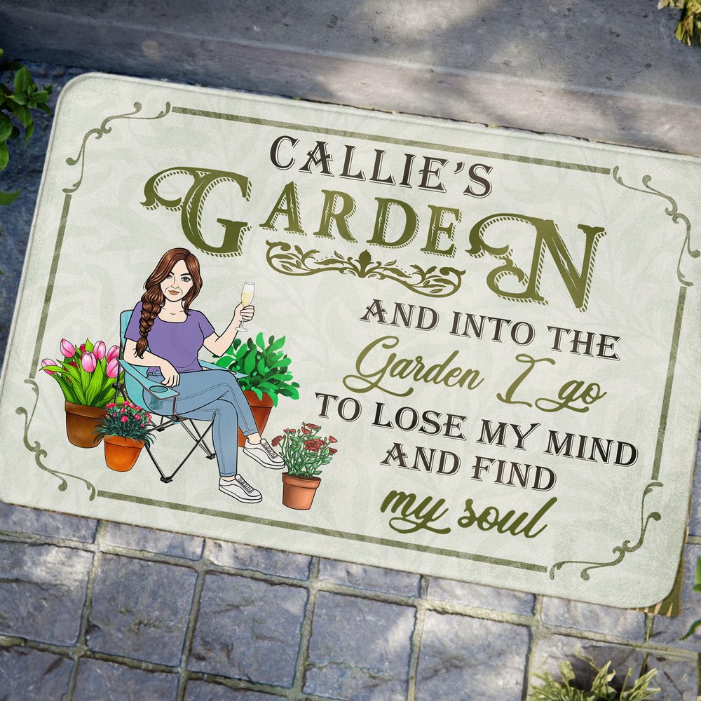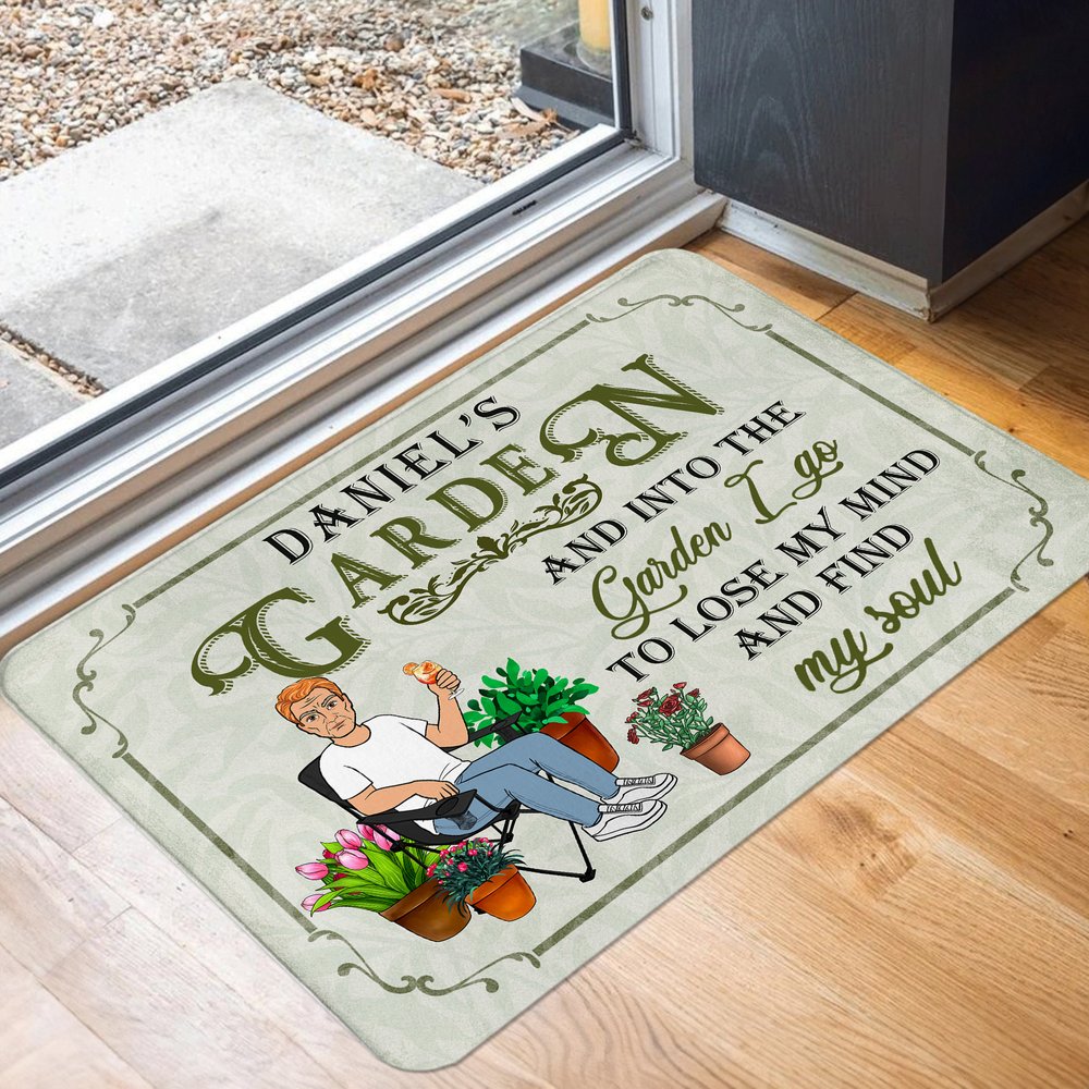 This doormat features a customizable design, showcasing delightful cartoon characters—available in both male and female forms—relaxing on chairs amidst a vibrant flower garden. Besides the figures, the fixed text "INTO THE GARDEN I GO TO LOSE MY MIND AND FIND MY SOUL" adds a poetic touch, blending whimsy with warmth.
