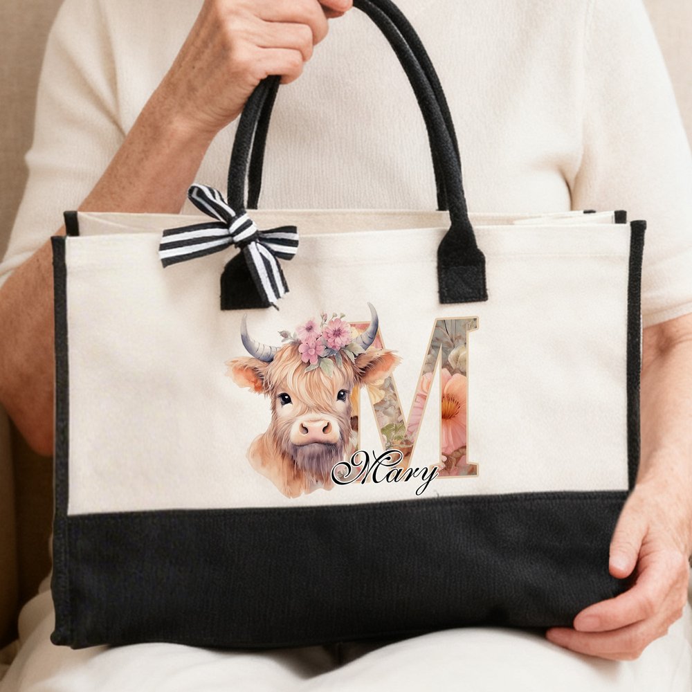 This tote bag with a personalised flower Highland Cow pattern is specially designed for those who love Highland Cow culture. We can customize your name prominently on the bag. Whether for personal use or as a gift to relatives and friends, it can convey deep love and care.