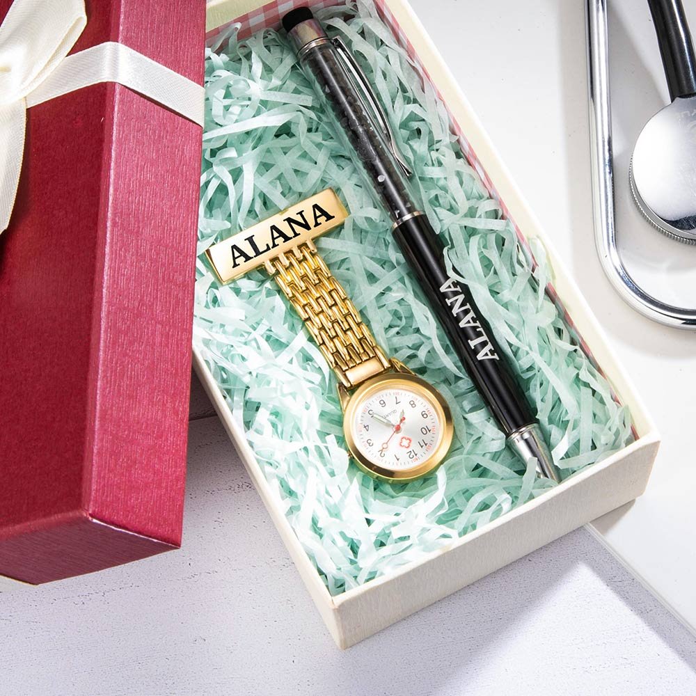 This fantastic Personalised gift contains a sanitary fob watch and a ballpoint pen. In addition to customizing the exclusive name on the products, you can choose from a variety of pen and watch colours.