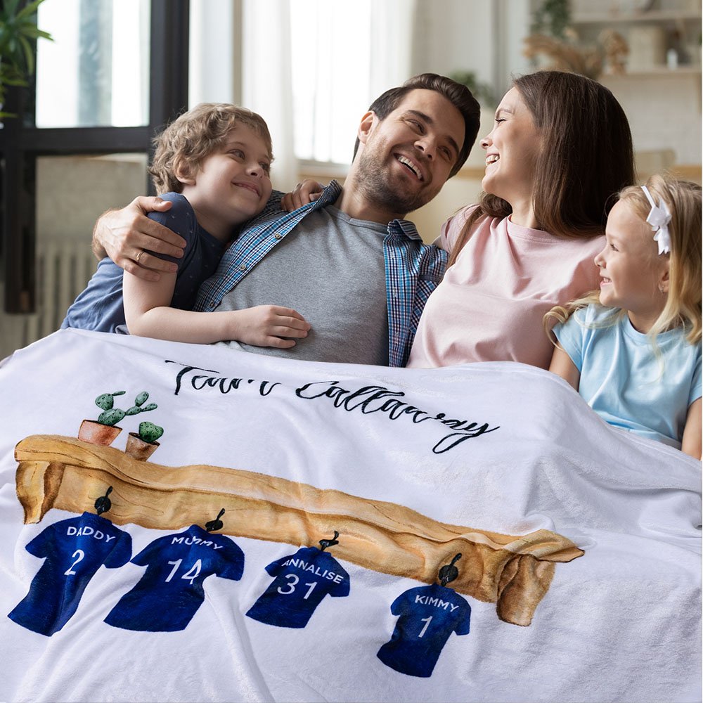 Our Personalised football-printed family blanket is a heartfelt gift that celebrates family and the love for football. This blanket can be customized with 1-6 names and numbers, creating a unique and Personalised keepsake.
