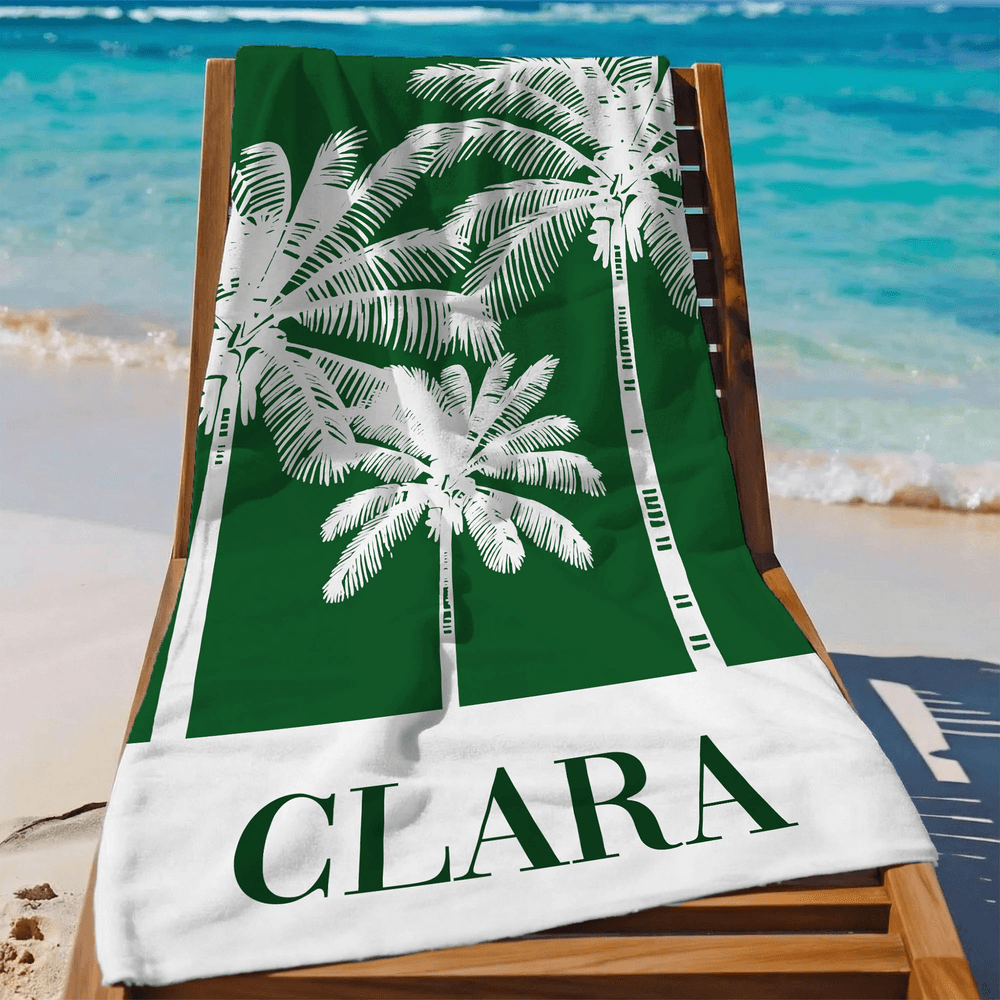 Featuring a refreshing summer palm tree pattern, each towel can be customized with your name. Simple yet sophisticated, it exudes a vacation vibe, making each one unique – a perfect blend of style and personality.