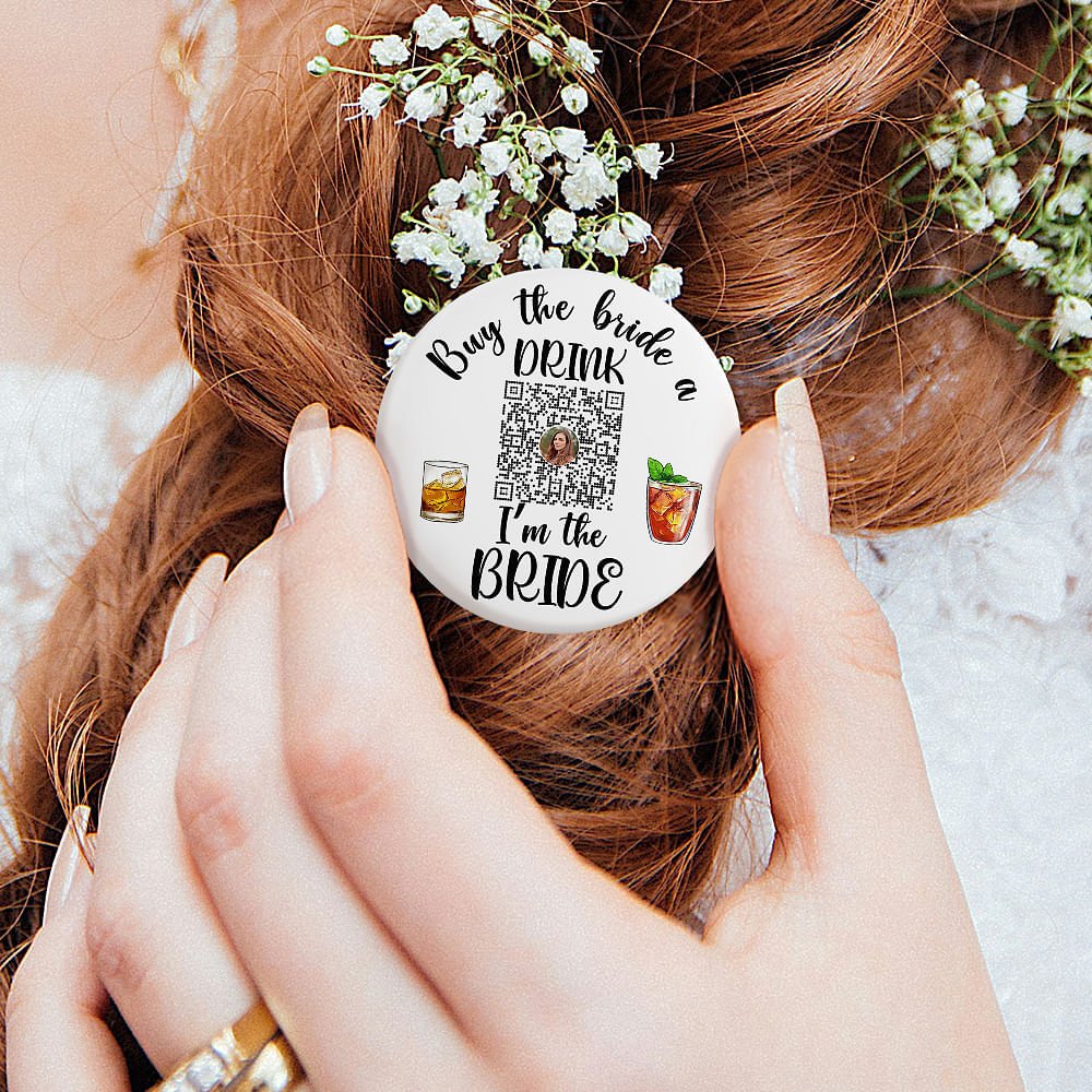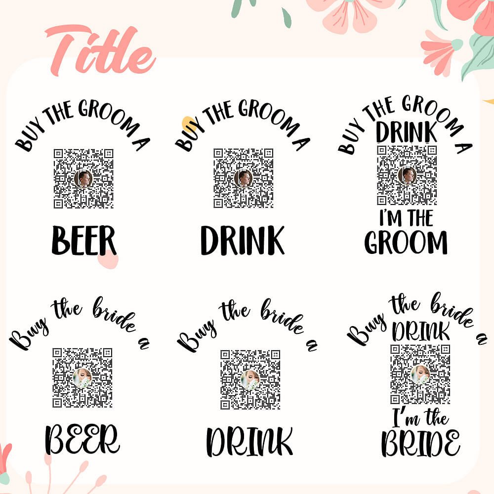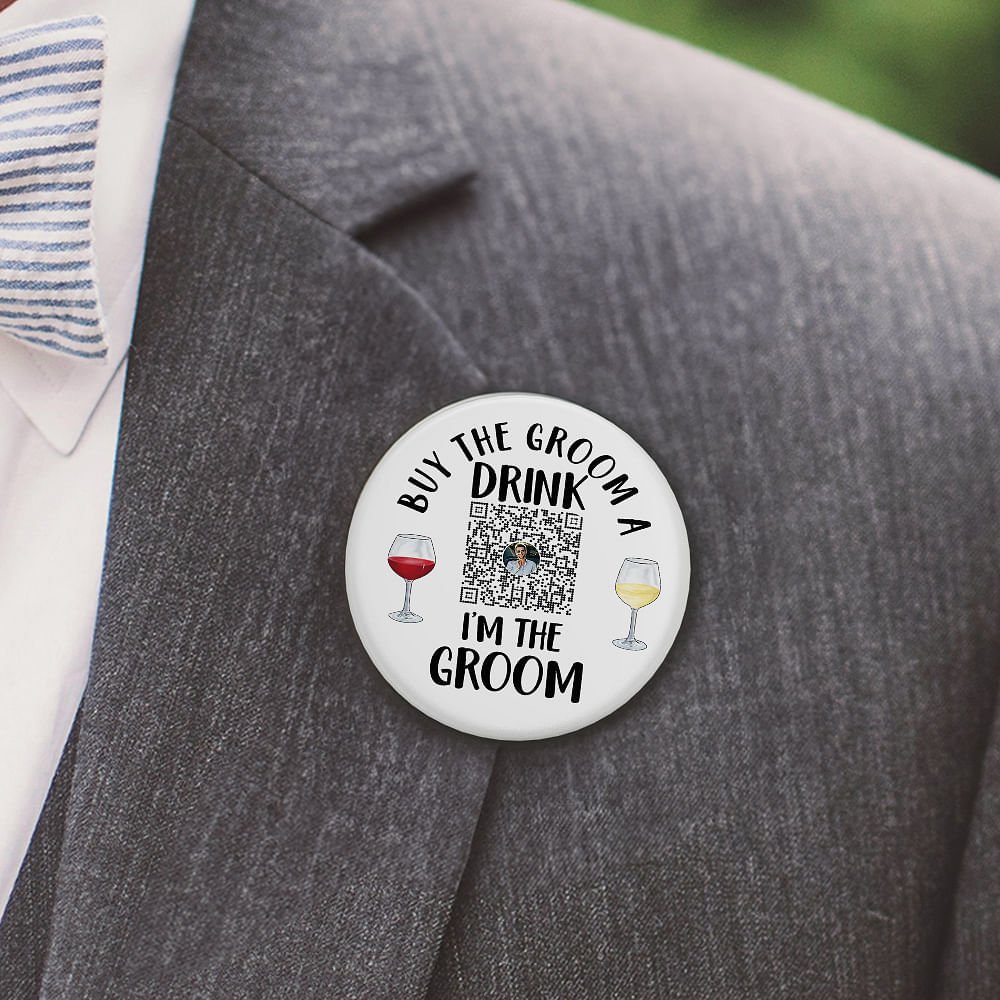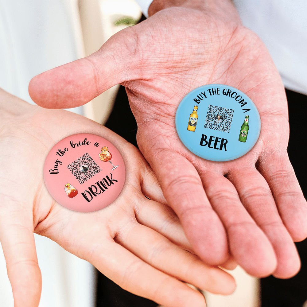 The design style of this badge is humorous and chic, you can choose from six different text styles about the bride and groom, and the centre of the badge is printed with the QR code you uploaded, and the other part of the badge is decorated with two drinks and beer images. These patterns vividly depict drinks, and their bright and inviting colours make the whole badge appear more lively and interesting.