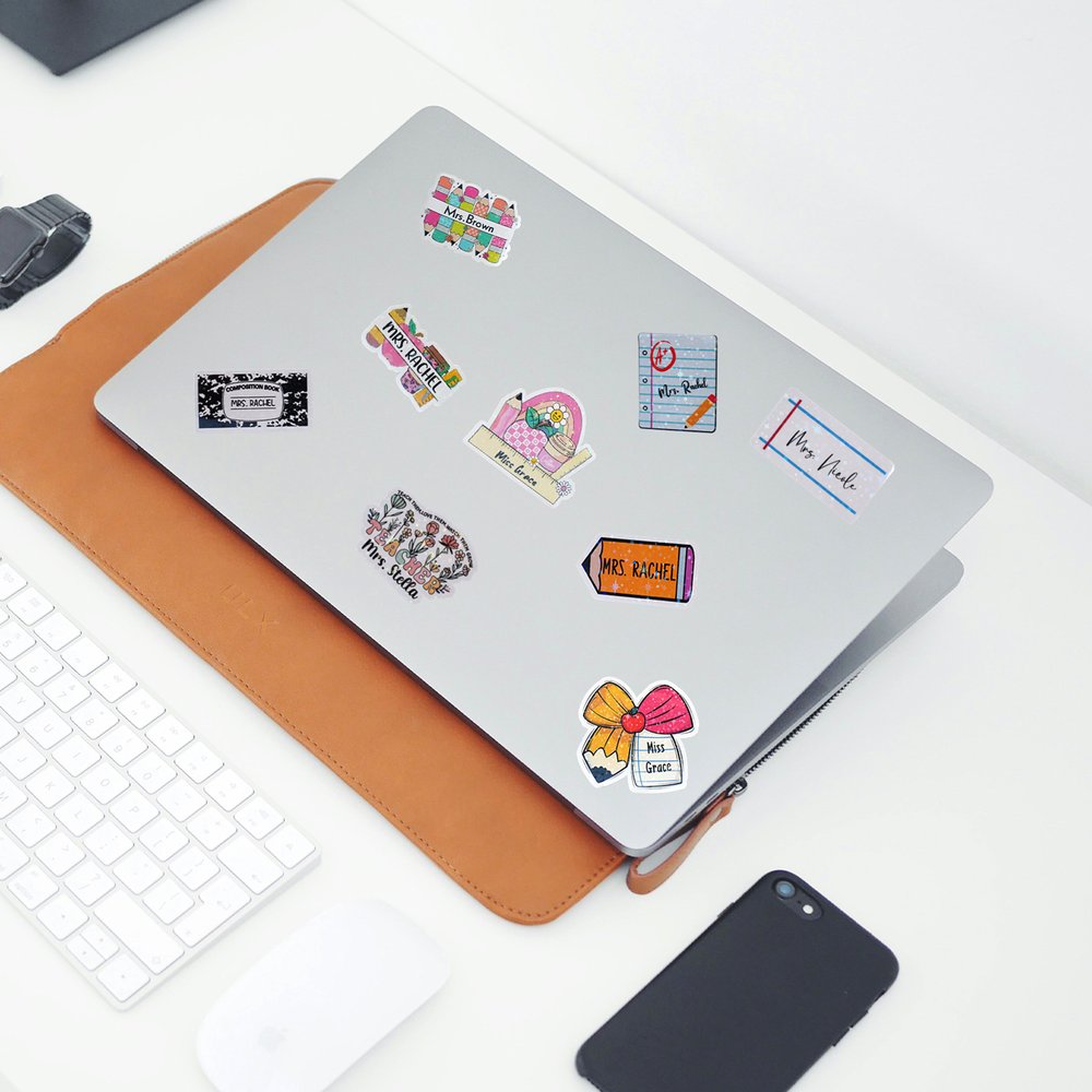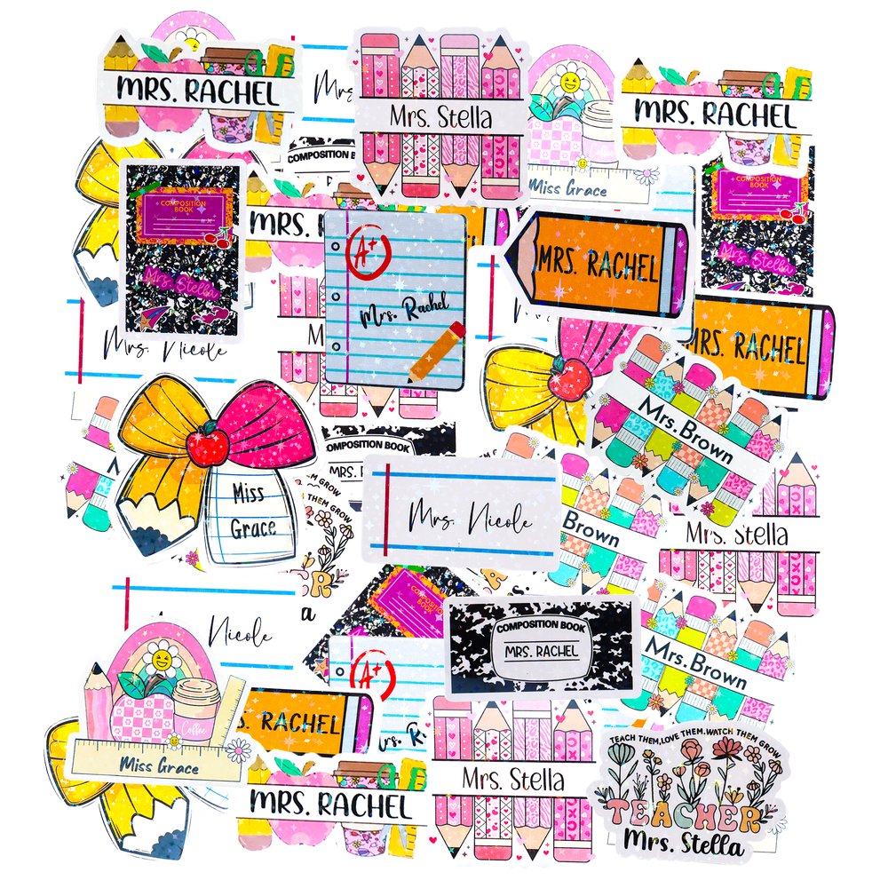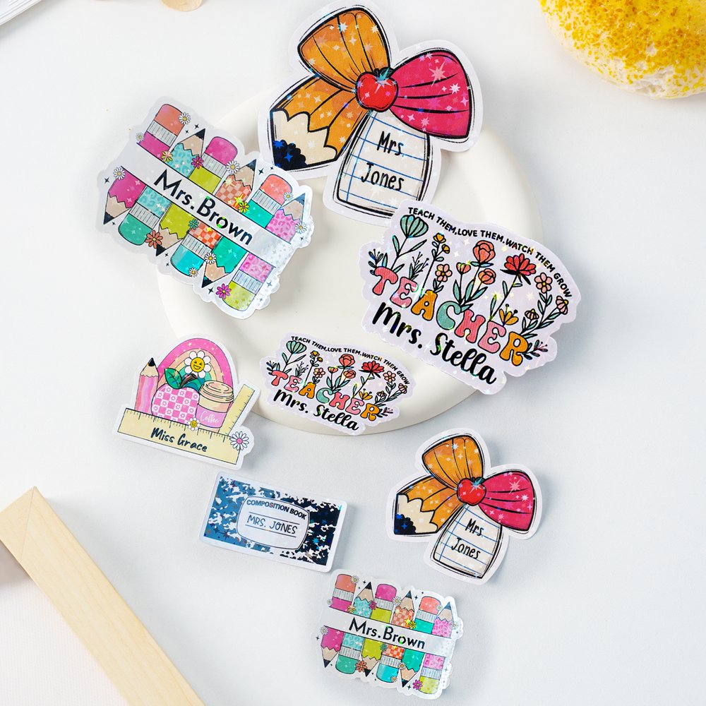 These stickers are coated with a shimmering film that sparkles and catches everyone’s eye! They feature adorable teacher-themed elements, including colourful pencils, notebooks, flowers, and coquette bows. Besides, each sticker can be Personalised with a title and surname to showcase your individuality and style. We also offer 3 size options, so you can choose the perfect fit for your needs!