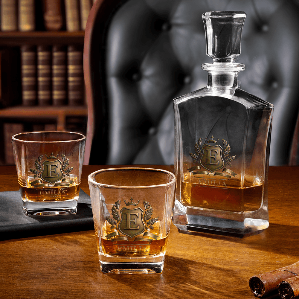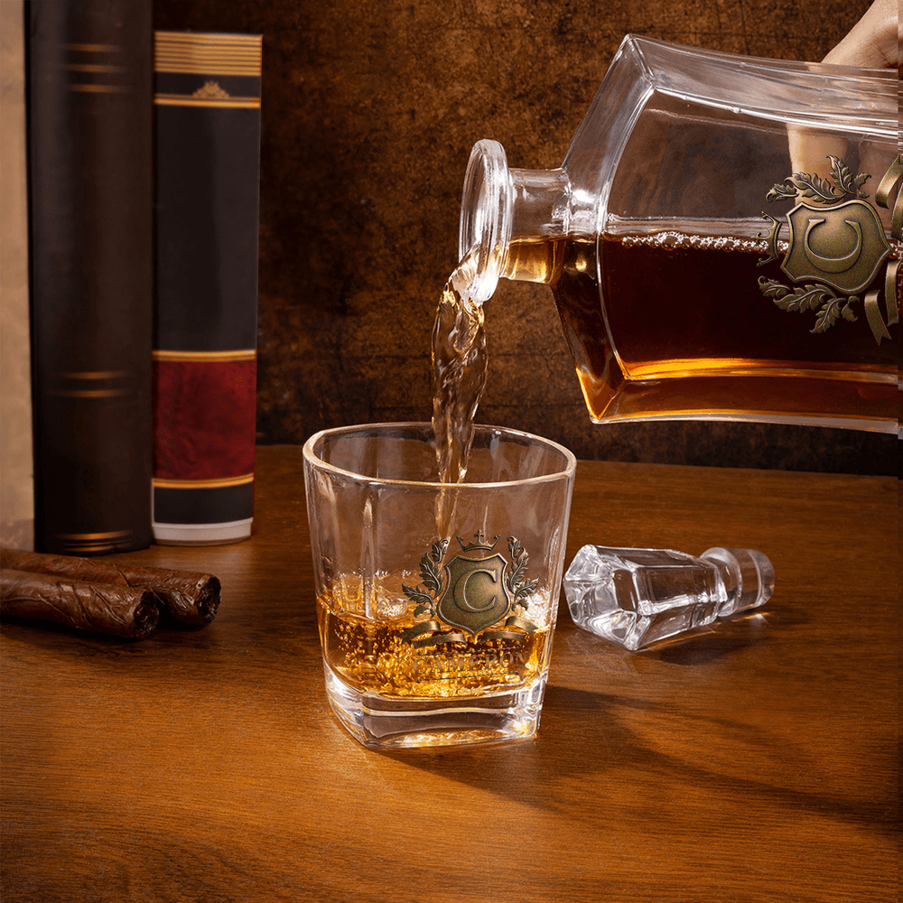 This whisky decanter centres around a golden crown and shield emblem, complemented by intricate decorative patterns, perfectly blending vintage elegance with personalised customization. The front of the bottle can be customized with your initials and full name, showcasing unique taste while serving as a striking symbol of identity and sophistication.