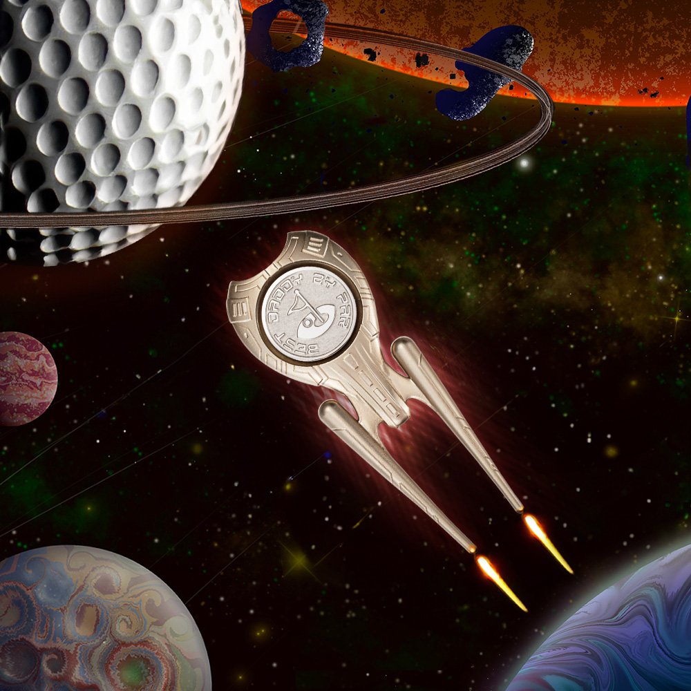 This golf divot repair tool features a strong sci-fi design, incorporating relief textures to create a three-dimensional effect. The product is made from high-quality metal material, which not only enhances its durability but also emphasizes its unique personality. The sleek and modern design makes it a perfect gift for golf enthusiasts.