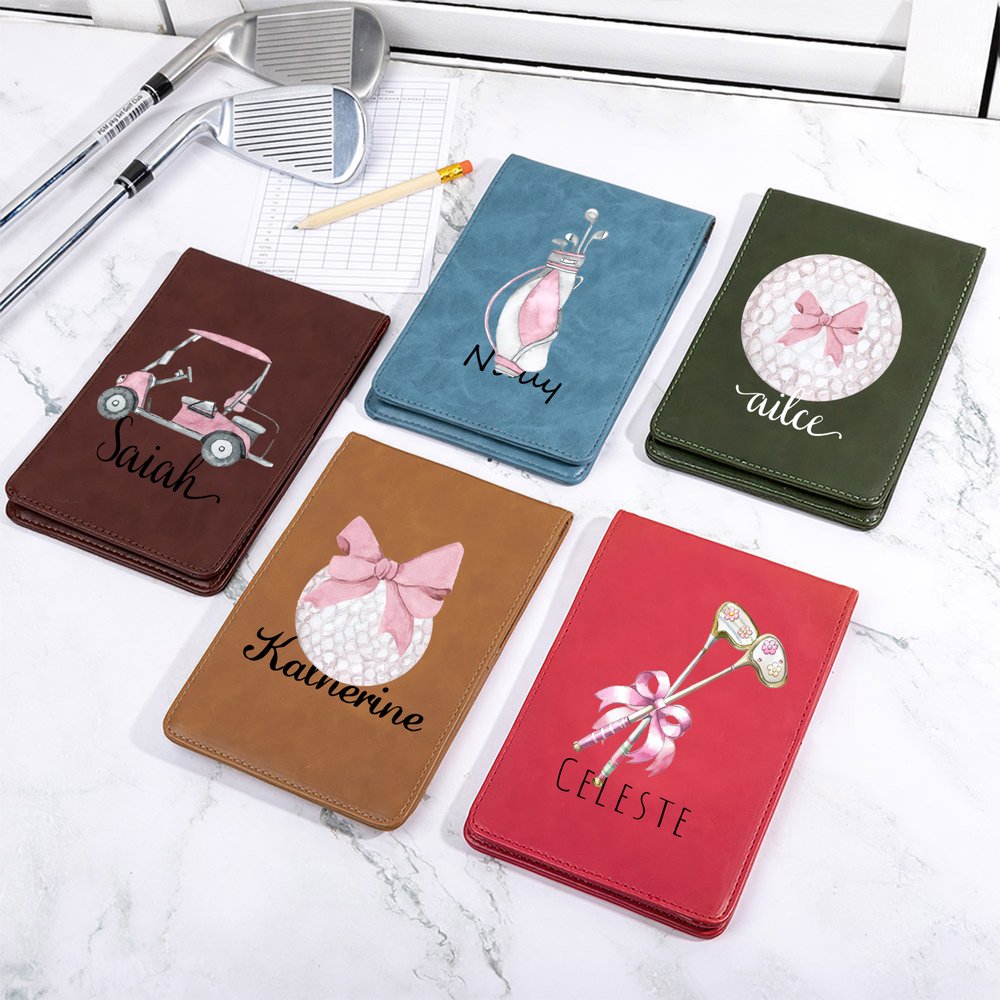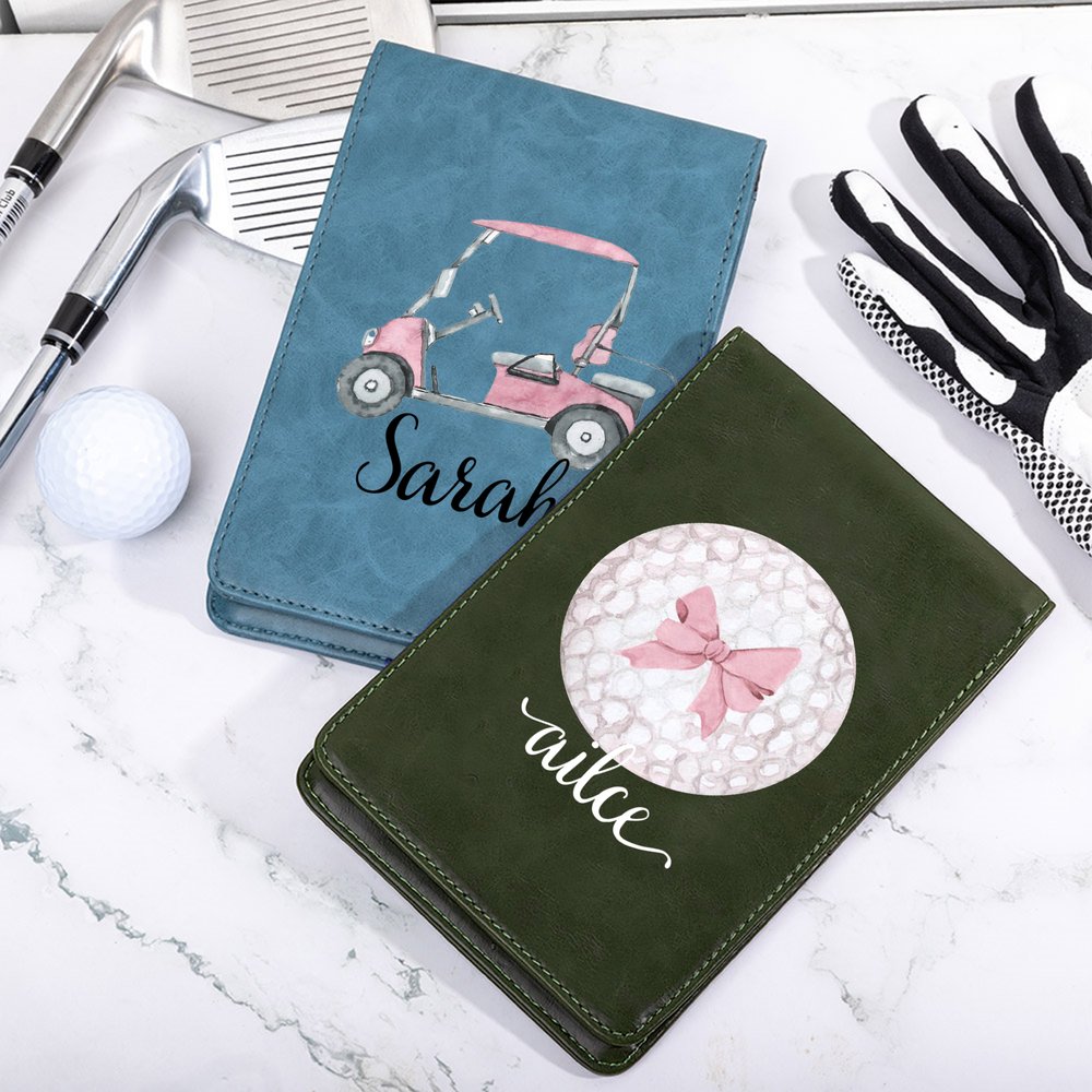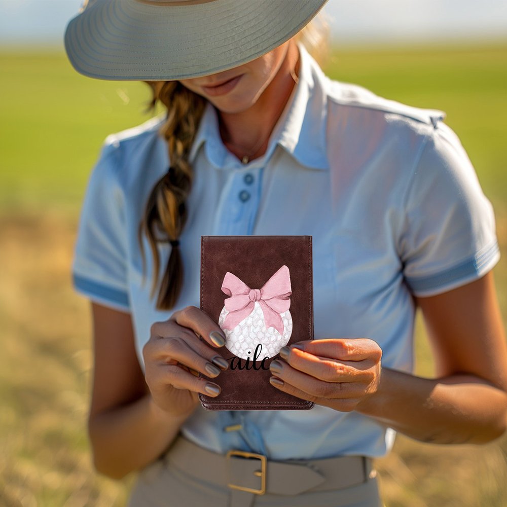 This golf scorecard holder is designed with an elegant pink bow and golf elements, making it a stylish and eye-catching accessory on the golf course, perfect for women who love golf.