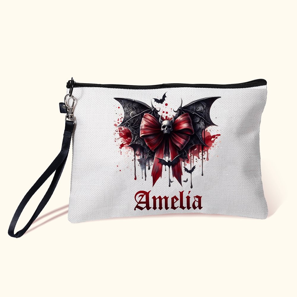 This makeup bag features a gothic skull bat bow pattern, full of spooky Halloween spirit, it can be customized with a personal name to make it a one-of-a-kind accessory.