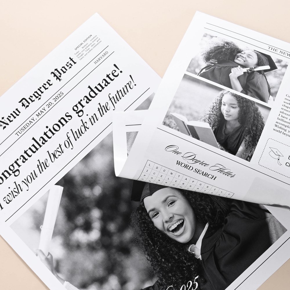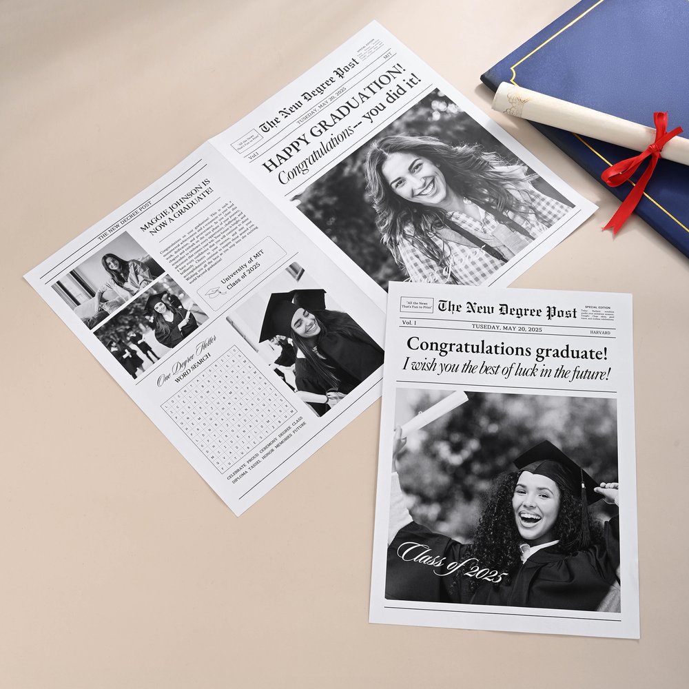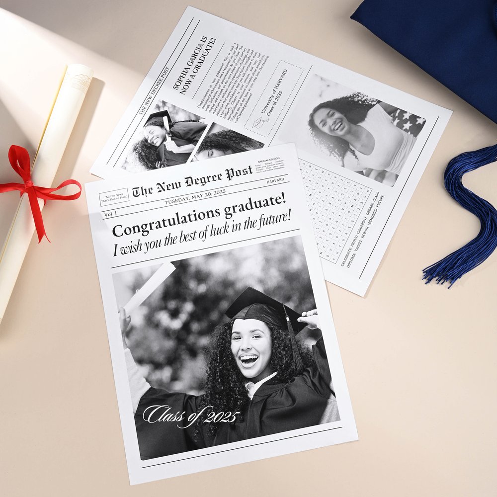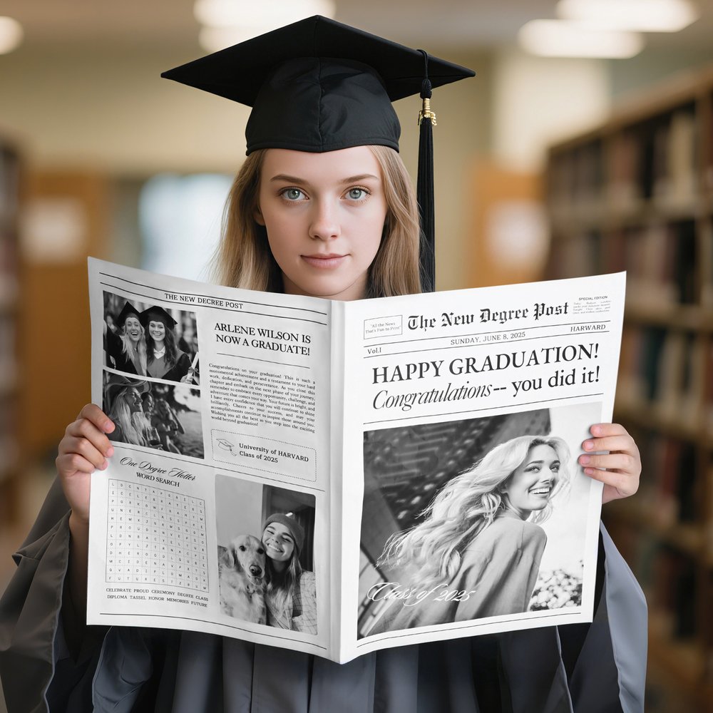 This newspaper is designed to mimic the style of a real newspaper, featuring bold headlines and a classic layout to celebrate the milestone achievements of graduates uniquely. Through personalised customization, you can incorporate photos, information, and memories, creating a gift of special significance that allows them to feel a sense of honor during graduation season.