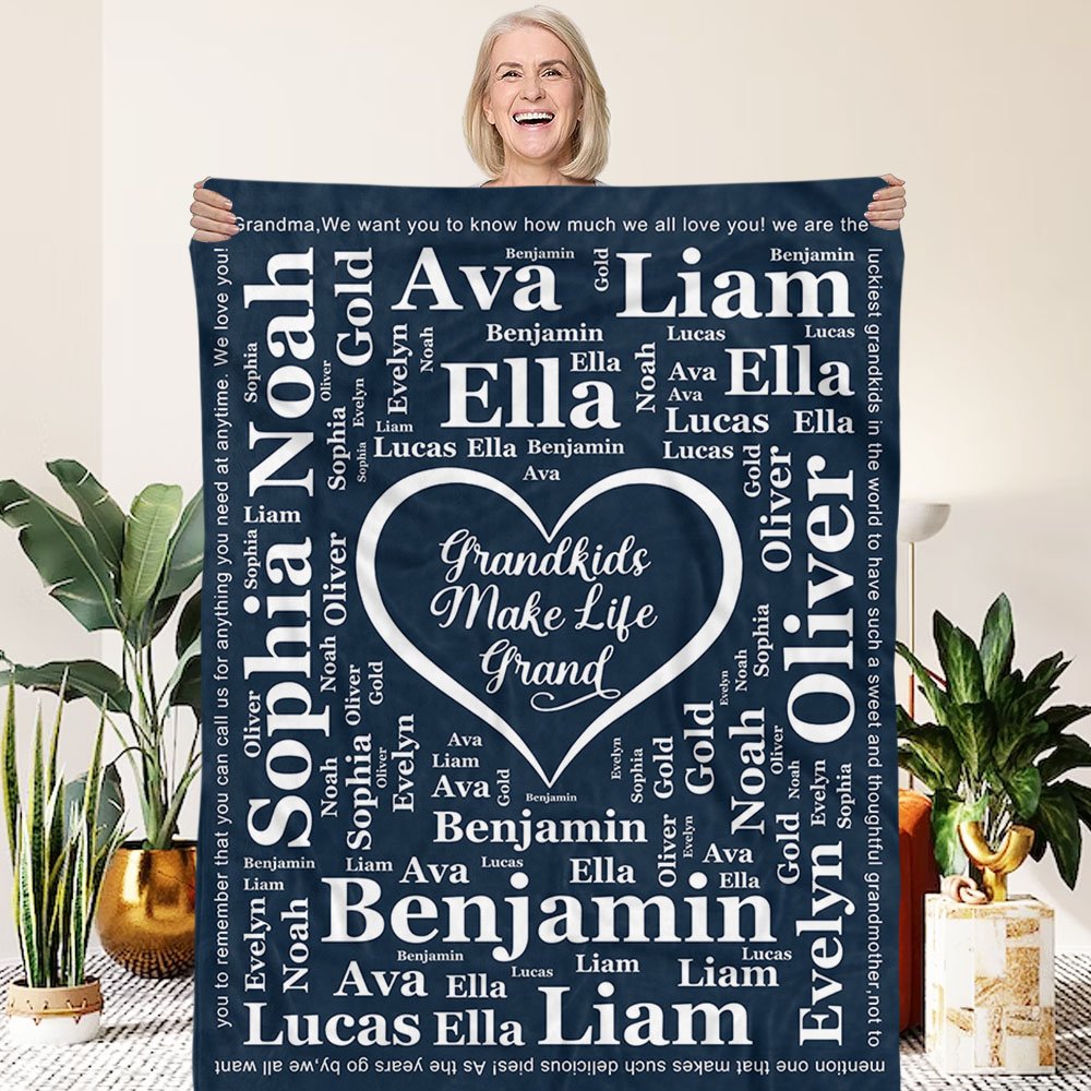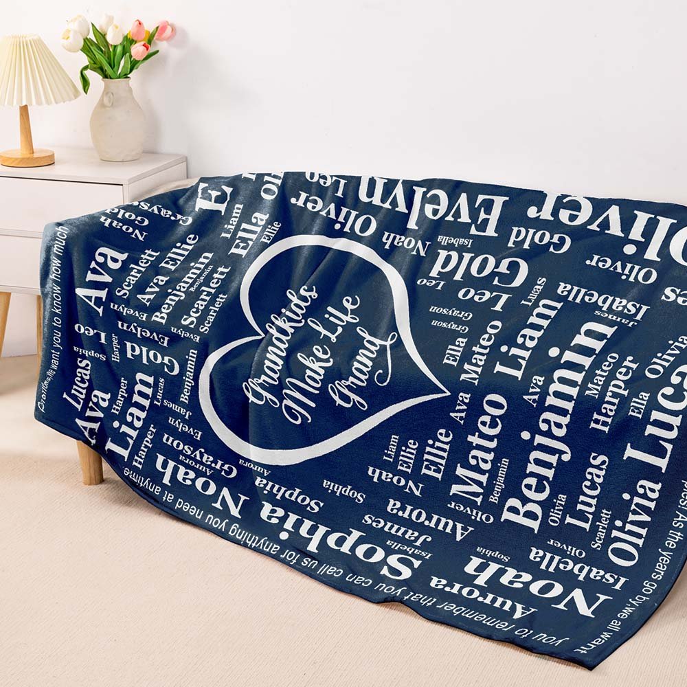"Grandkids Make Life Grand" blankets make great gifts for grandparents or great-grandparents! Grandma or grandpa will feel the warmth of your loving words as they are wrapped up in the warmth of their cozy gift blanket with the names of all the grandchildren, which grandparents will be delighted to receive! For Christmas, Thanksgiving, anniversaries, grandma's birthday, or other special occasions, grandma's or grandpa‘s own special blanket with the names of her grandchildren will be their most precious gift.