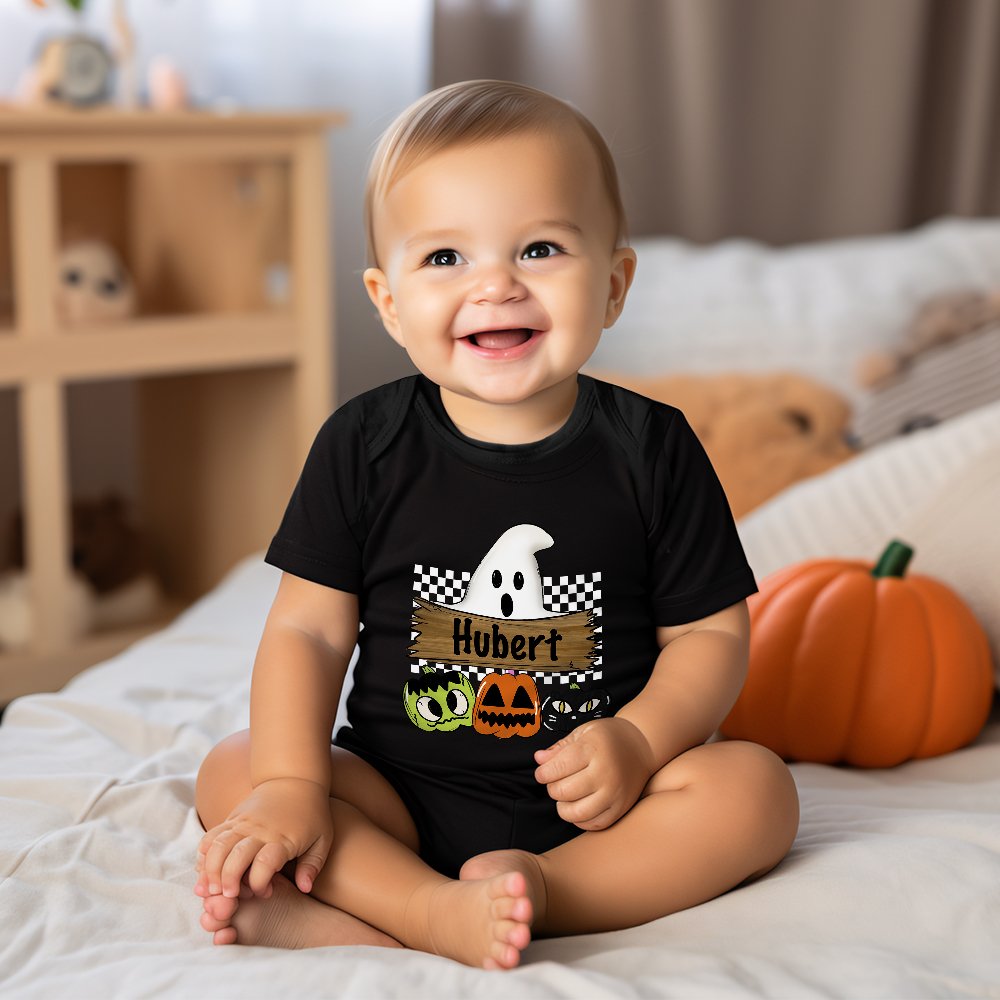 Our Personalised Halloween baby onesie not only lets you add a name or family name but also incorporate charming elements like pumpkins, black cats, and ghost, it captures the essence of Halloween perfectly. A perfect outfit for your little bundle of joy this Halloween season!