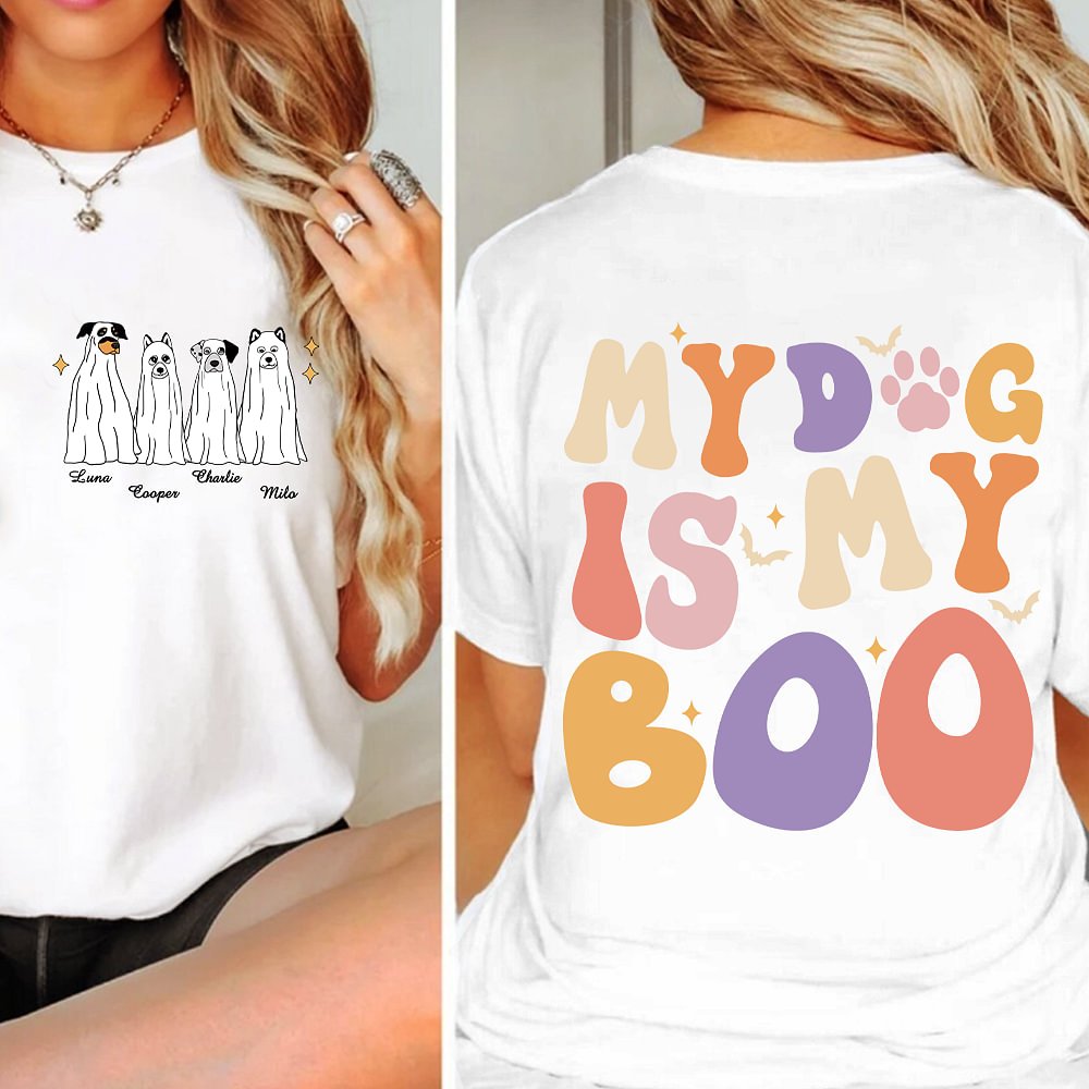 This "My Dog Is My Boo" T-shirt boasts a design that's as unique as the bond you share with your four-legged companion. A cute ghostly dog silhouette, playfully integrated with the text, creates a delightful and slightly spooky visual that captures the essence of Halloween while celebrating your love for your pup.