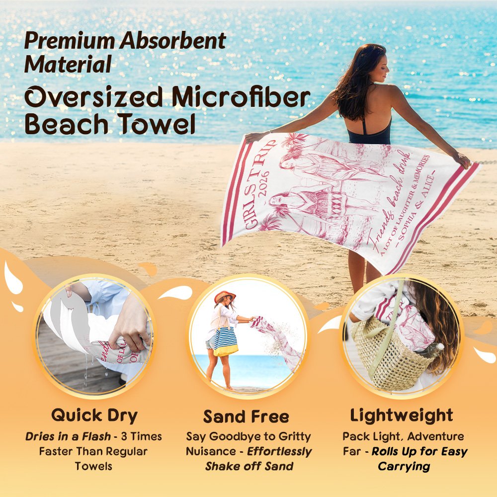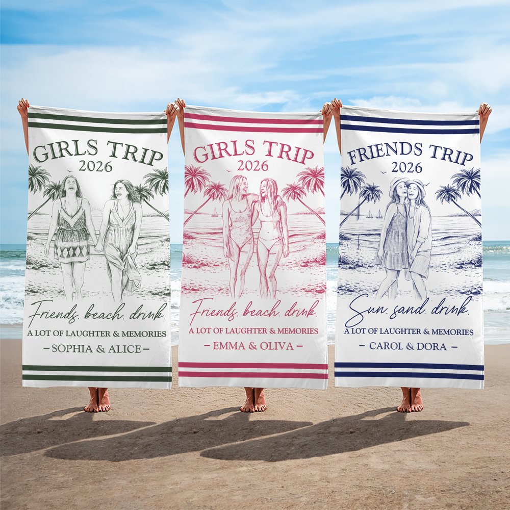 This beach towel supports you to upload a cherished photo of your closest friends, family, and loved ones. We’ll turn them into a delicate hand-drawn style, paired with tropical palm trees, soft sandy beaches, and other vacation-inspired elements to bring your sunny holiday memories to life. You can also customize it with a title, names, year, and heartfelt text, creating a one-of-a-kind souvenir to remember your beach getaway.