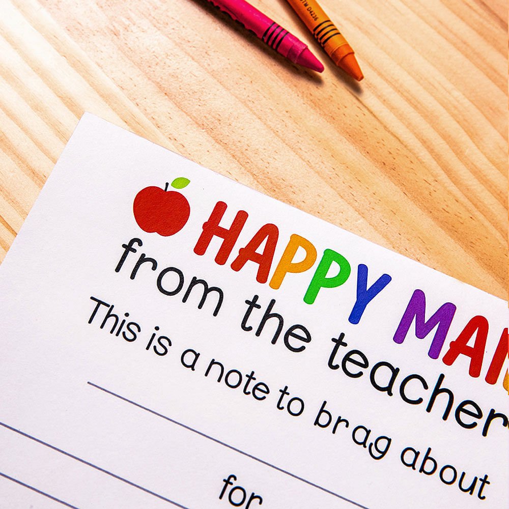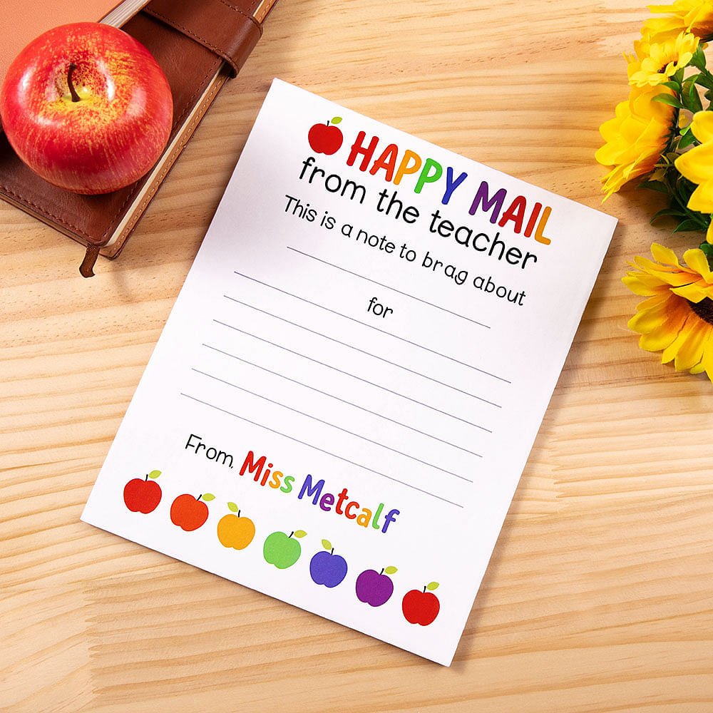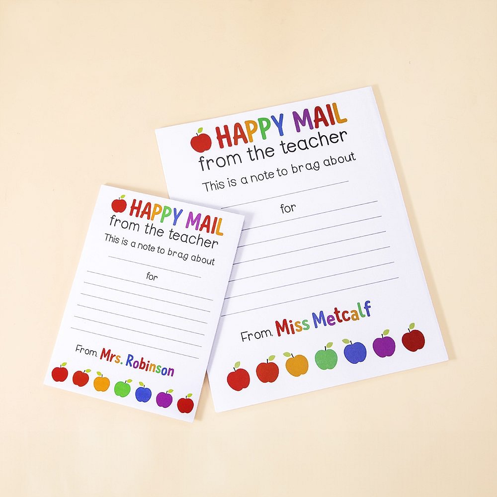 The notepad features a charming apple design, symbolizing education and positivity. The phrase "Happy Mail From The Teacher" is displayed in a playful, bold font at the top, making it eye-catching and inviting. Below, the text "This is a note to brag about" is presented in a slightly smaller font, encouraging students and parents to take pride in their achievements.