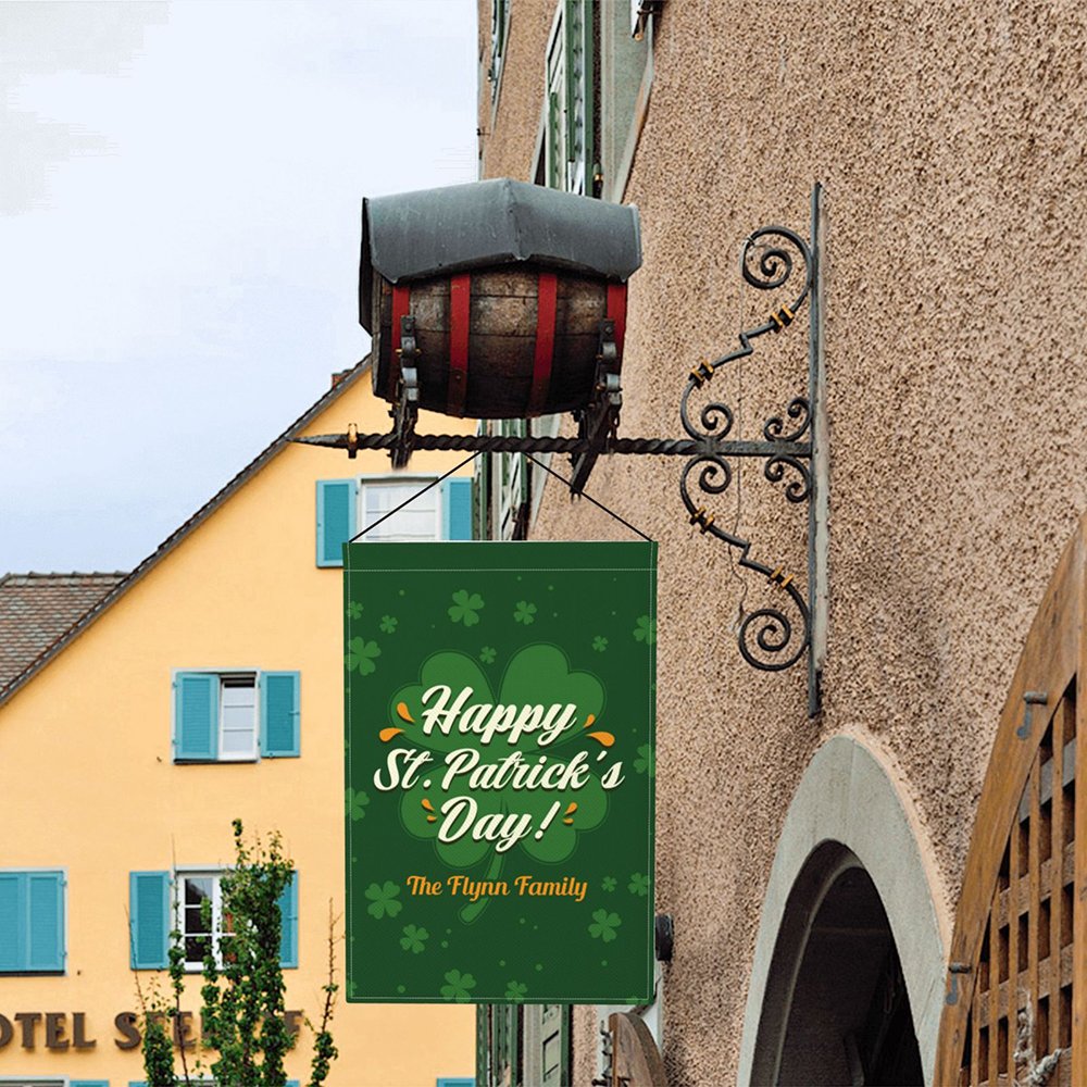 This garden flag features a classic four-leaf clover design with happy St. Patrick's Day slogans and customizable text. You can add your message, family name, or any other desired text to make it unique and special.