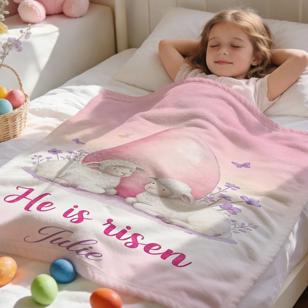Featuring colourful Easter eggs, crosses, and lambs, along with the text "He is risen" and a customizable name, the bright and cheerful design creates a festive atmosphere, adding a touch of Easter-themed fun to your child's everyday life.
