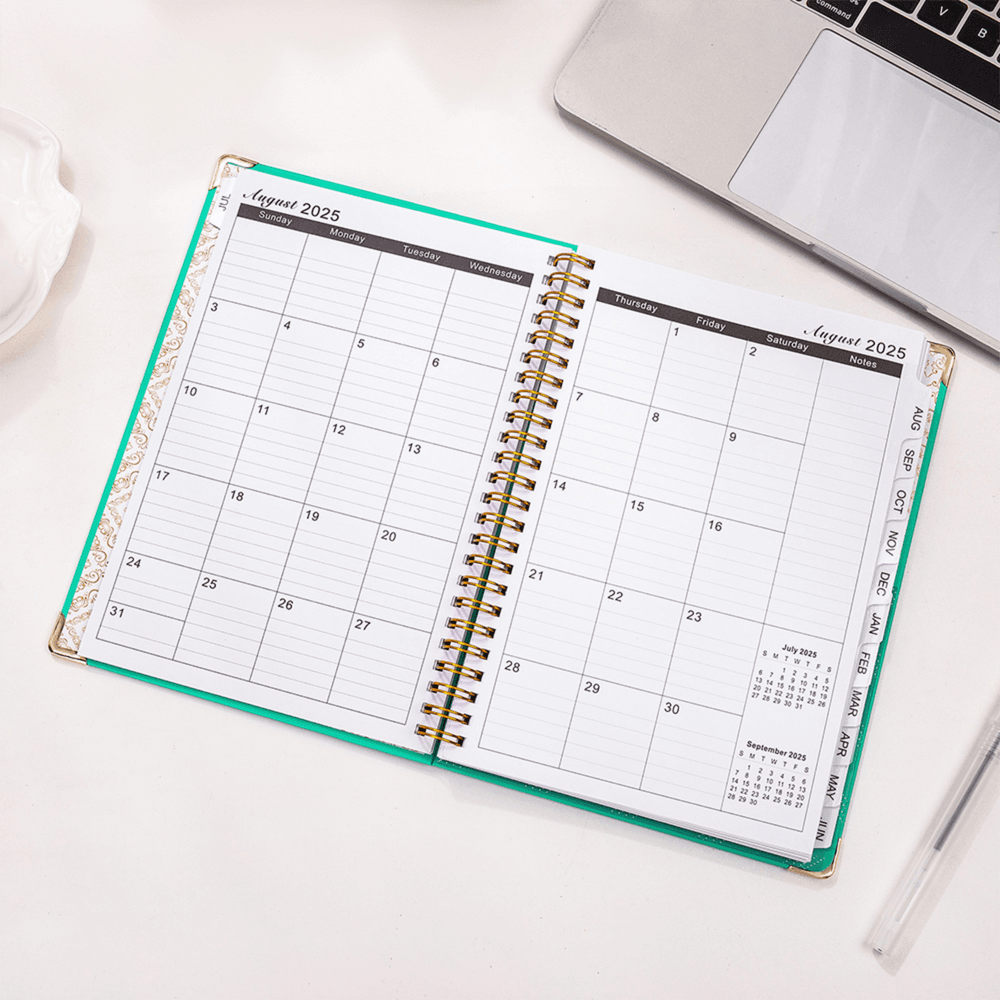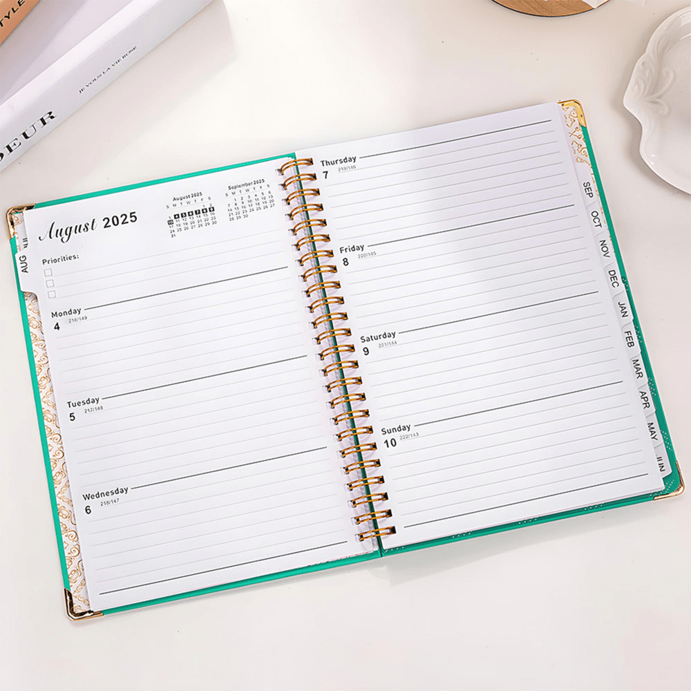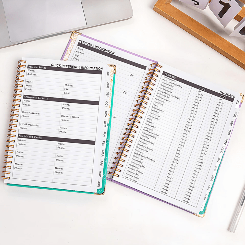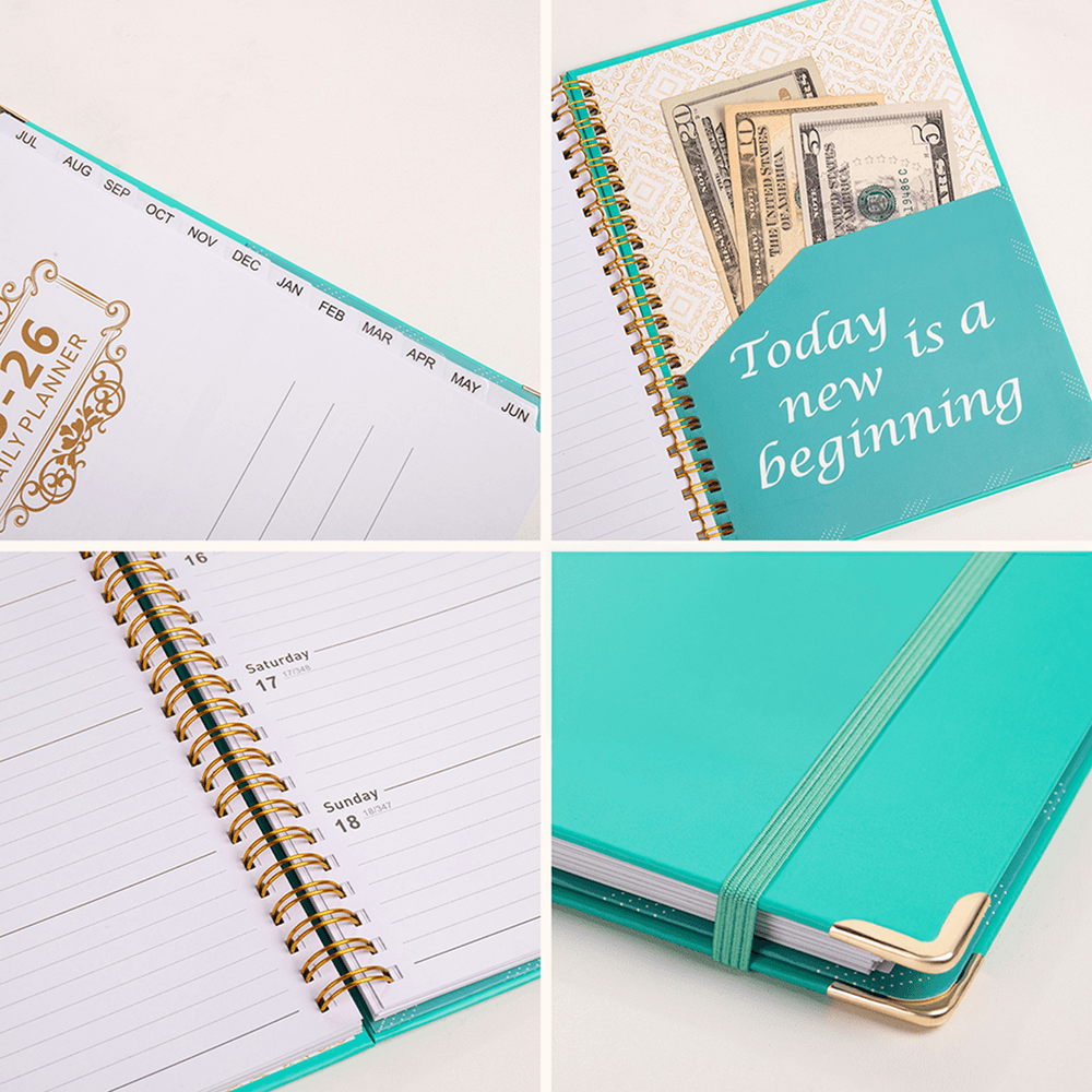 Crafted with a high-quality hardcover that resists stains and scratches, this planner protects the inner pages and maintains its pristine condition even with prolonged use. The metal spiral binding, along with an internal elastic band closure and pocket inserts, ensures smooth page turning and convenient writing.