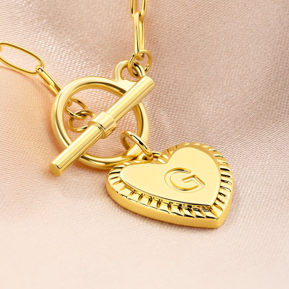 You can create a one-of-a-kind necklace by engraving a single initial from A to Z on the heart-shaped pendant. The toggle clasp design adds a distinctive touch, turning a simple accessory into a personal tribute that celebrates your unique identity.