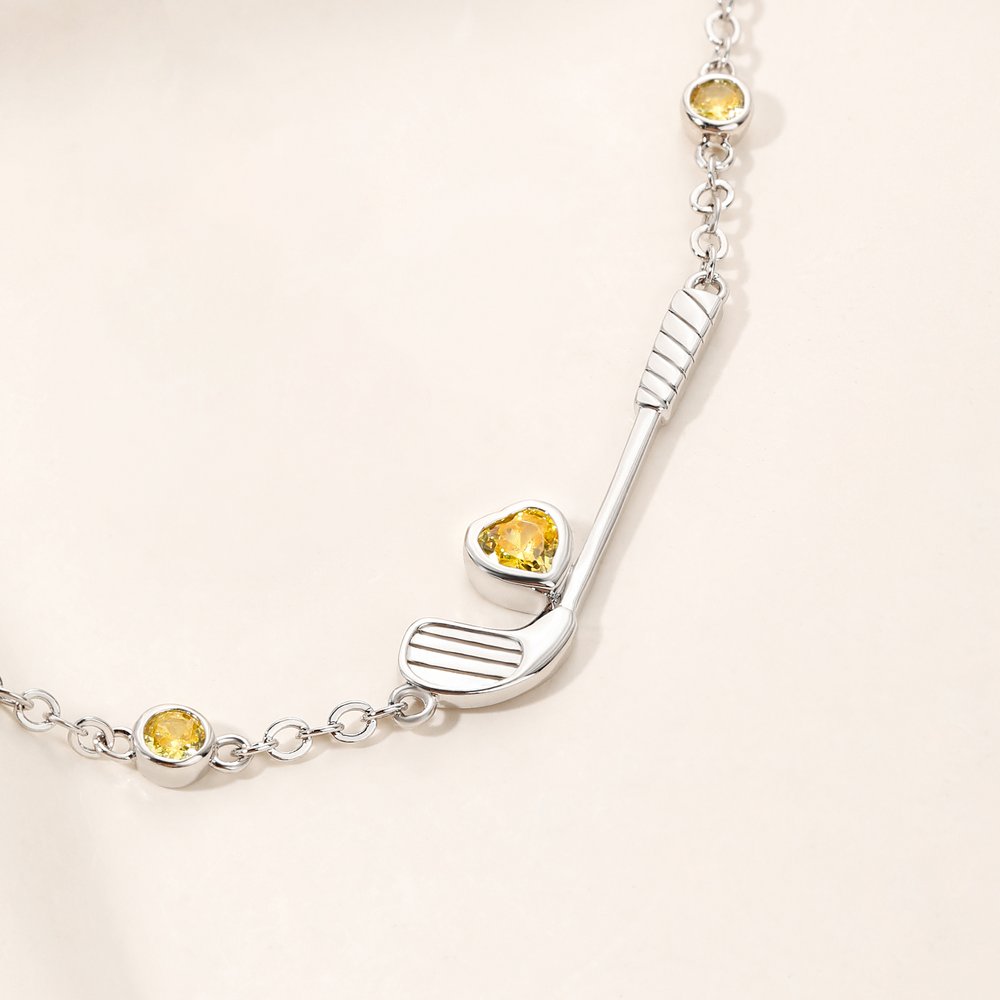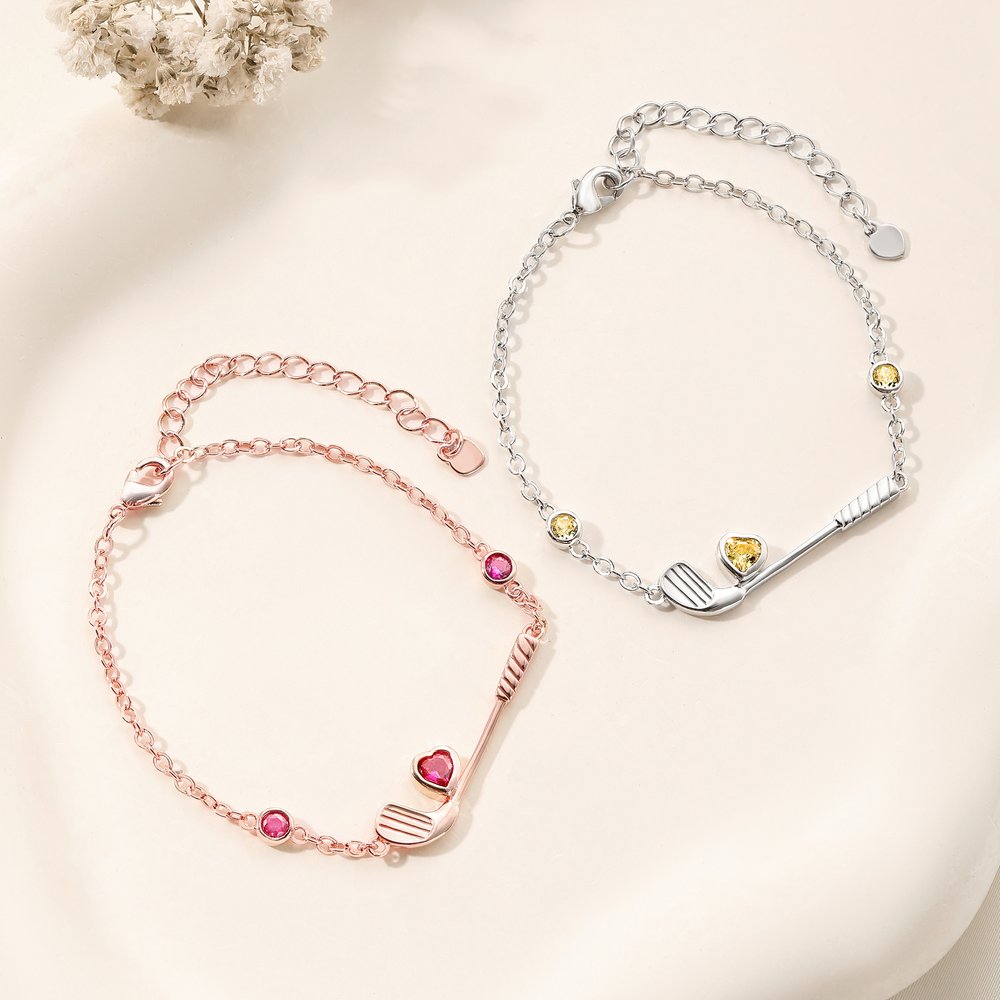 The bracelet features a golf club as its core, cleverly incorporating a heart-shaped birthstone element. Sparkling birthstones are set into the sides of the club and the heart, and the chain connection adds a stylish touch. The overall design is elegant and sophisticated, highlighting the sport while remaining trendy and effortlessly showcasing the wearer's passion for golf and unique personality.