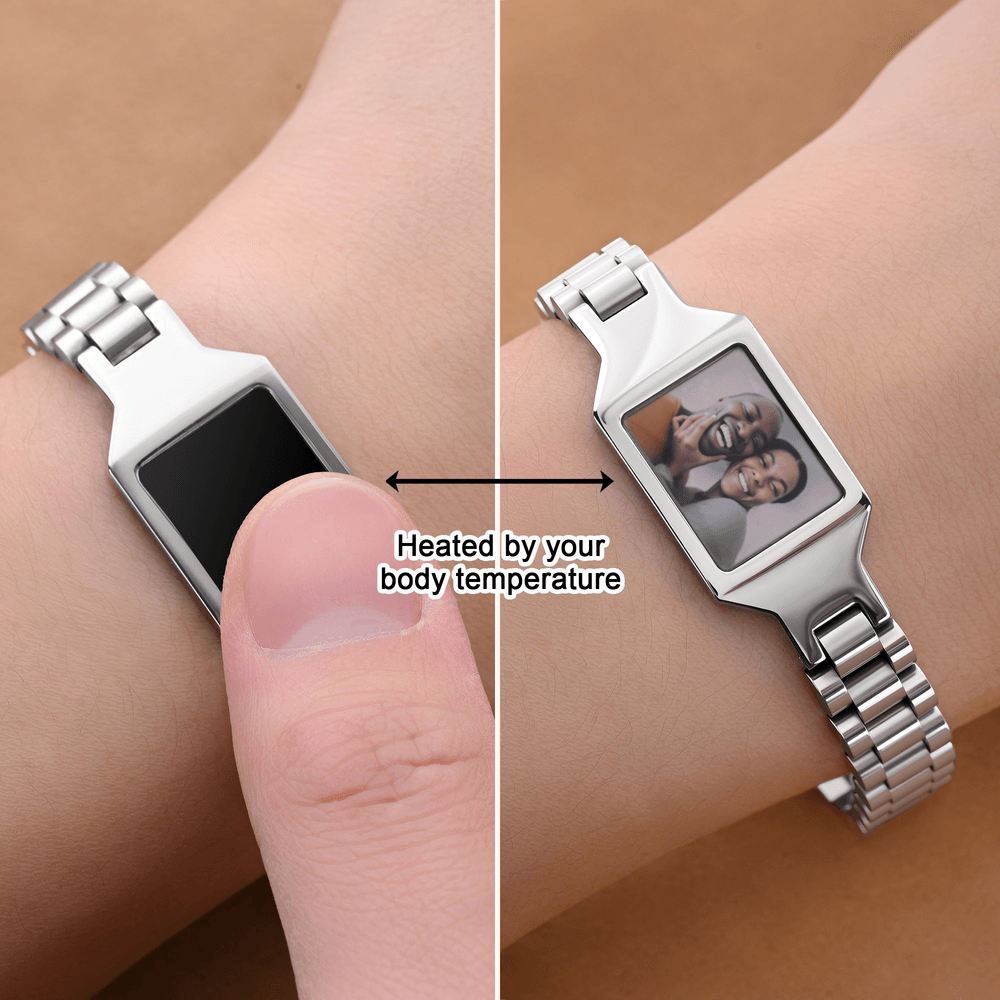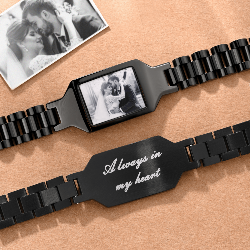 This personalised men’s bracelet features a sleek stainless steel band with a dual-sided design: one side is a heat-reactive photo panel that reveals your custom image only when warmed by body temperature, while the reverse side can be engraved with meaningful text like "LOVE YOU FOREVER". The minimalist watchband-style link structure adds a modern, masculine touch, making it a subtle yet sentimental accessory that hides precious memories until touched.