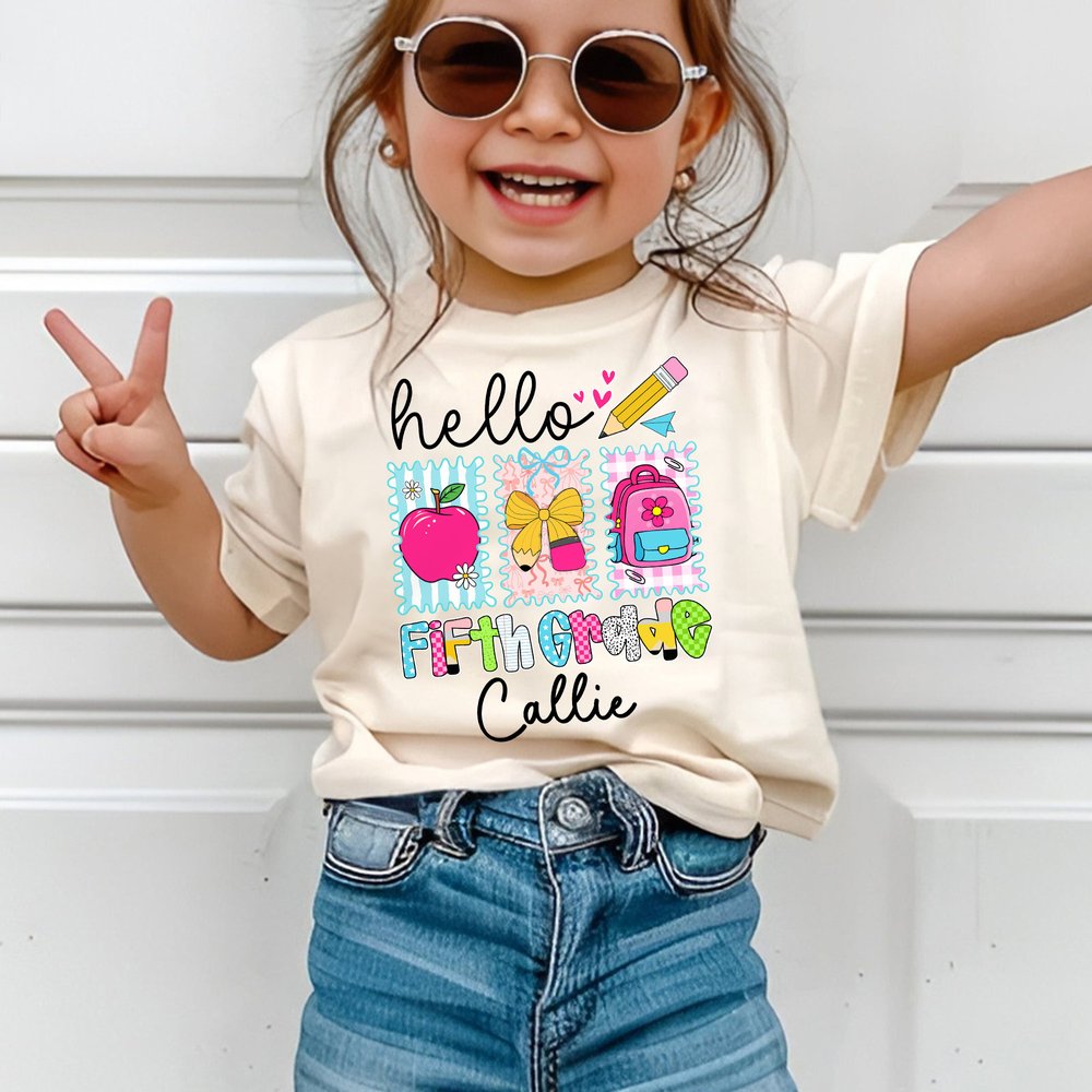 This soft T-shirt is adorned with delightful school-themed illustrations such as apples, pencil bows, and backpacks. You can customize your name and grade on the clothes, celebrating the fun of education with every detail, turning a basic T-shirt into a wearable expression of back-to-school excitement.