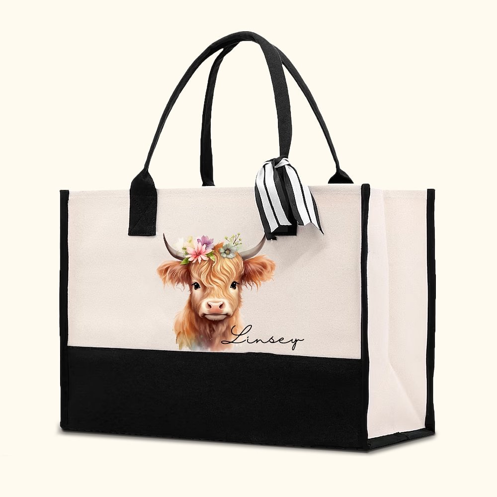 Personalised Floral Highland Cow Canvas Large Tote Bag with Name and Ribbon Birthday Christmas Travel Accessories Gift for Her