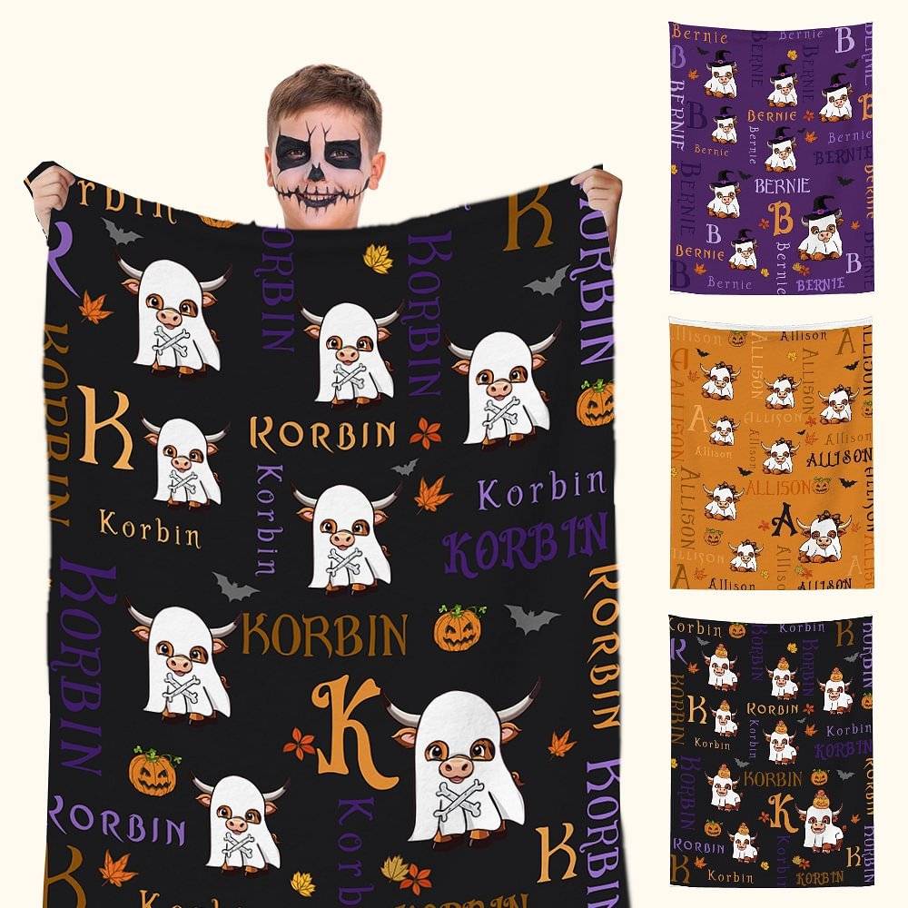 The blanket features an adorable Halloween highland cow, creating a unique and festive atmosphere. What sets this blanket apart is the option to customize it with your child's name, making it truly special and one-of-a-kind.