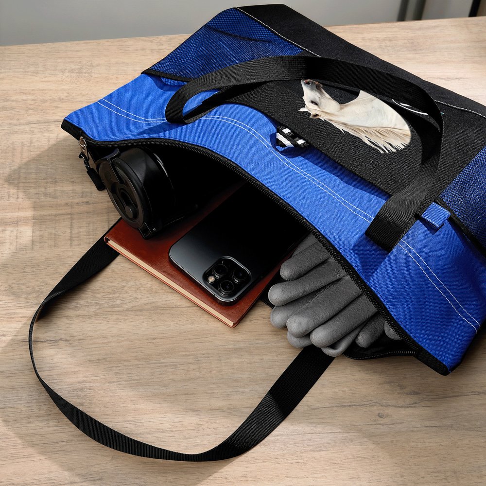 Its spacious design easily accommodates everyday essentials, from riding gear and horse grooming supplies to laptops, notebooks, water bottles, and lunches. Three front pockets provide convenient organization and are perfect for storing small items such as phones, keys, lip balm, or student passes. A zippered interior pocket offers extra security for valuables. The contrasting colour design is not only aesthetically pleasing but also effectively distinguishes different compartments.
