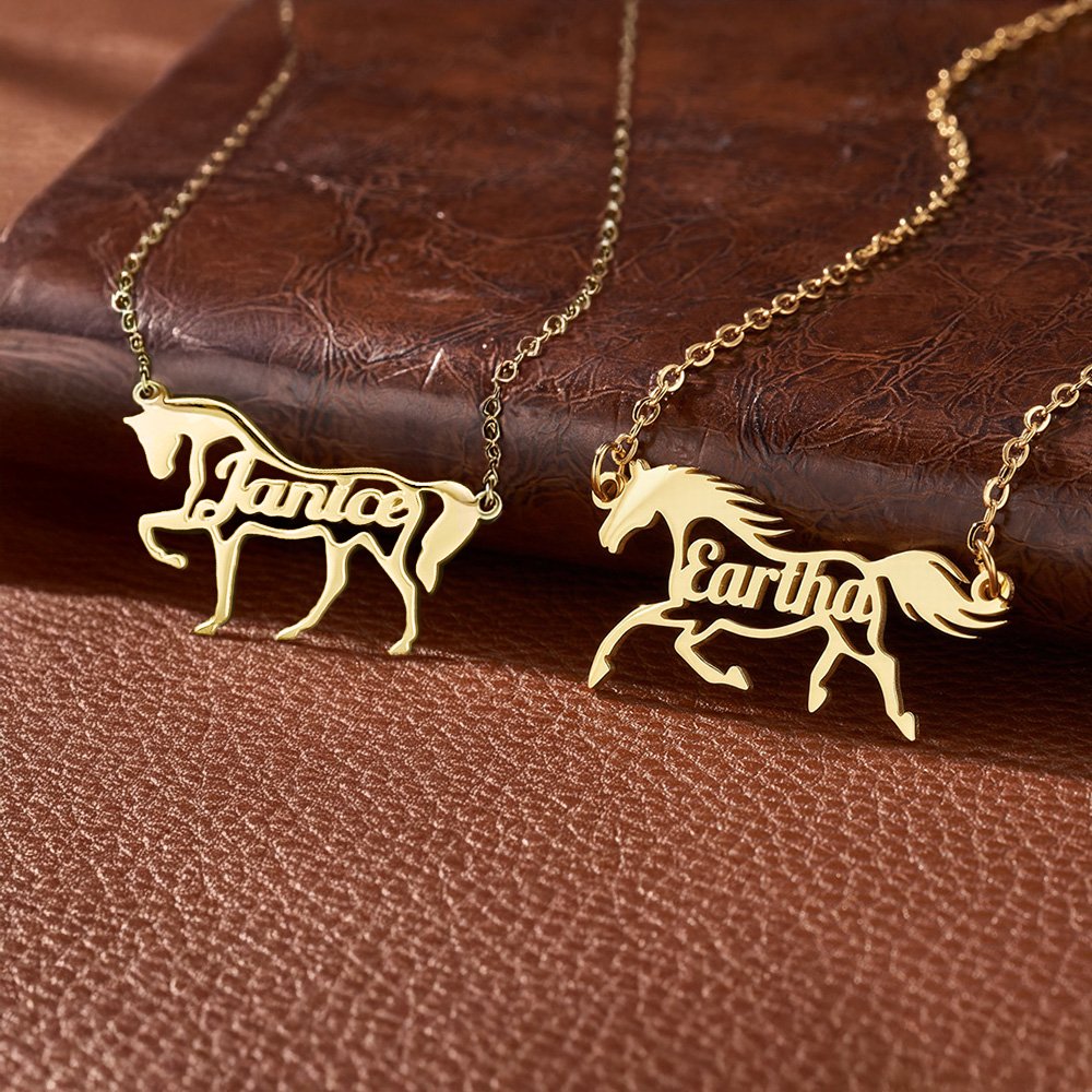 This horse-shaped necklace offers two action design options—run or head down—showcasing the majestic silhouette of a horse and perfectly embodying the elegance of the equestrian spirit. It also thoughtfully incorporates your chosen name, highlighting personal flair and style.