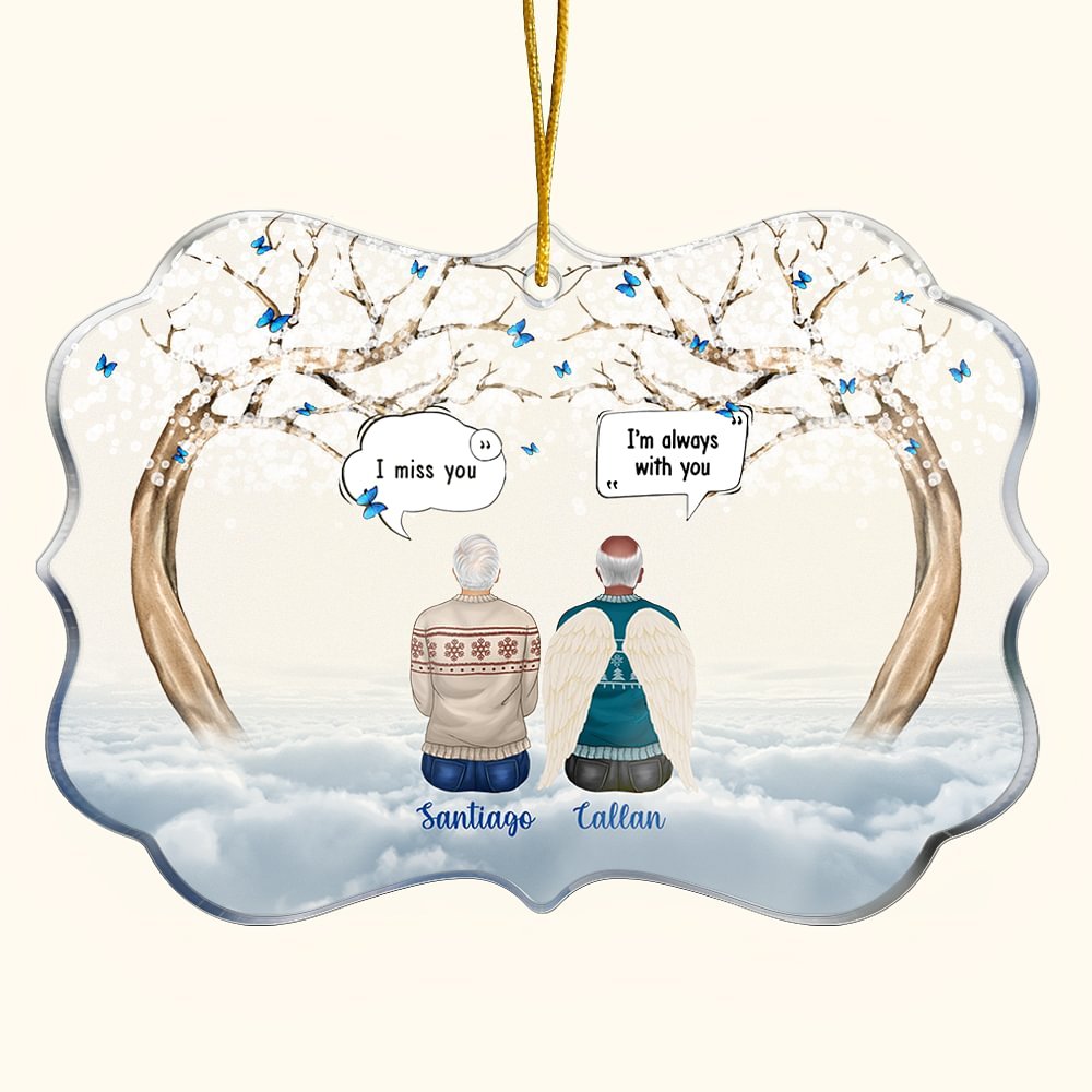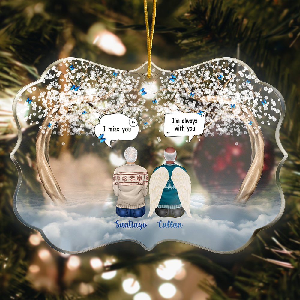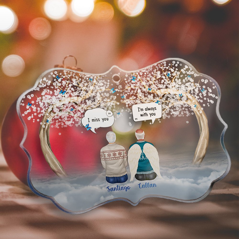 Uniquely designed, this acrylic hanging ornament features a charming scene combined with a Christmas element that shows a heartwarming image of family or friends spending time together. With the addition of "I Miss You I'm Always With You" and a Personalised message, it will be a special keepsake that celebrates the everlasting love between people.