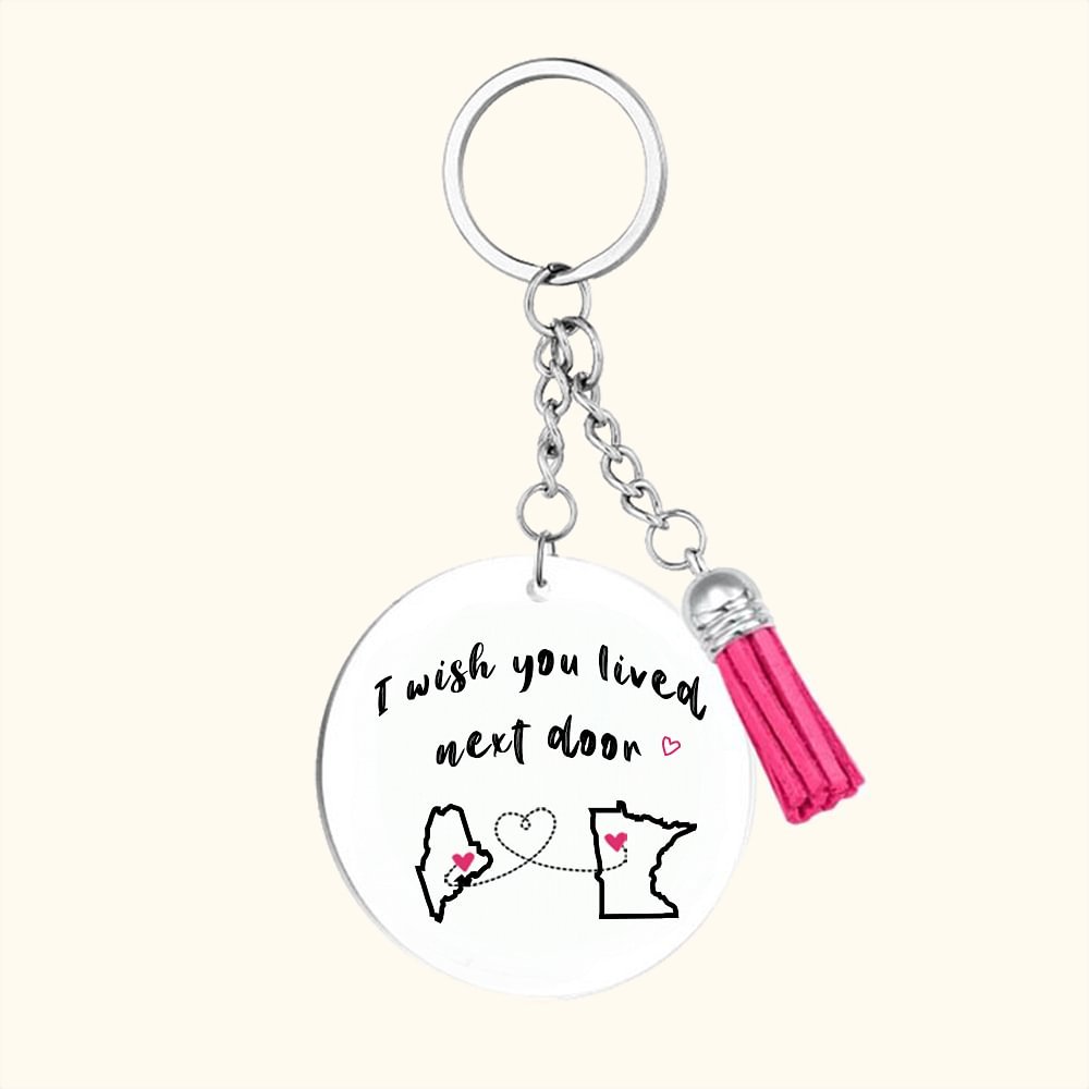 This beautiful keychain is designed with two maps of different states connected by a heart and a line, symbolizing that although we are far apart, our relationship is profound. You can enter your and the other person's state address to create a unique keepsake.