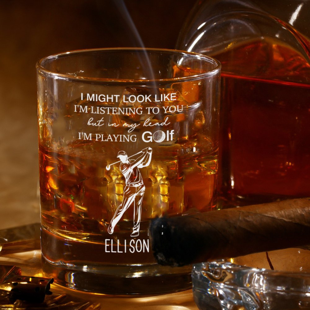 Experience a unique blend of humor and style with this whisky glass, which boldly states, “I MIGHT LOOK LIKE I'M LISTENING TO YOU, but in my head I'M PLAYING GOLF,” and features a charming golfer pattern. This eye-catching design not only elevates any drinking occasion but also adds a personal touch to your moments. Plus, with the option to customize it with a special name, you’re guaranteed a truly exceptional piece that feels uniquely yours.