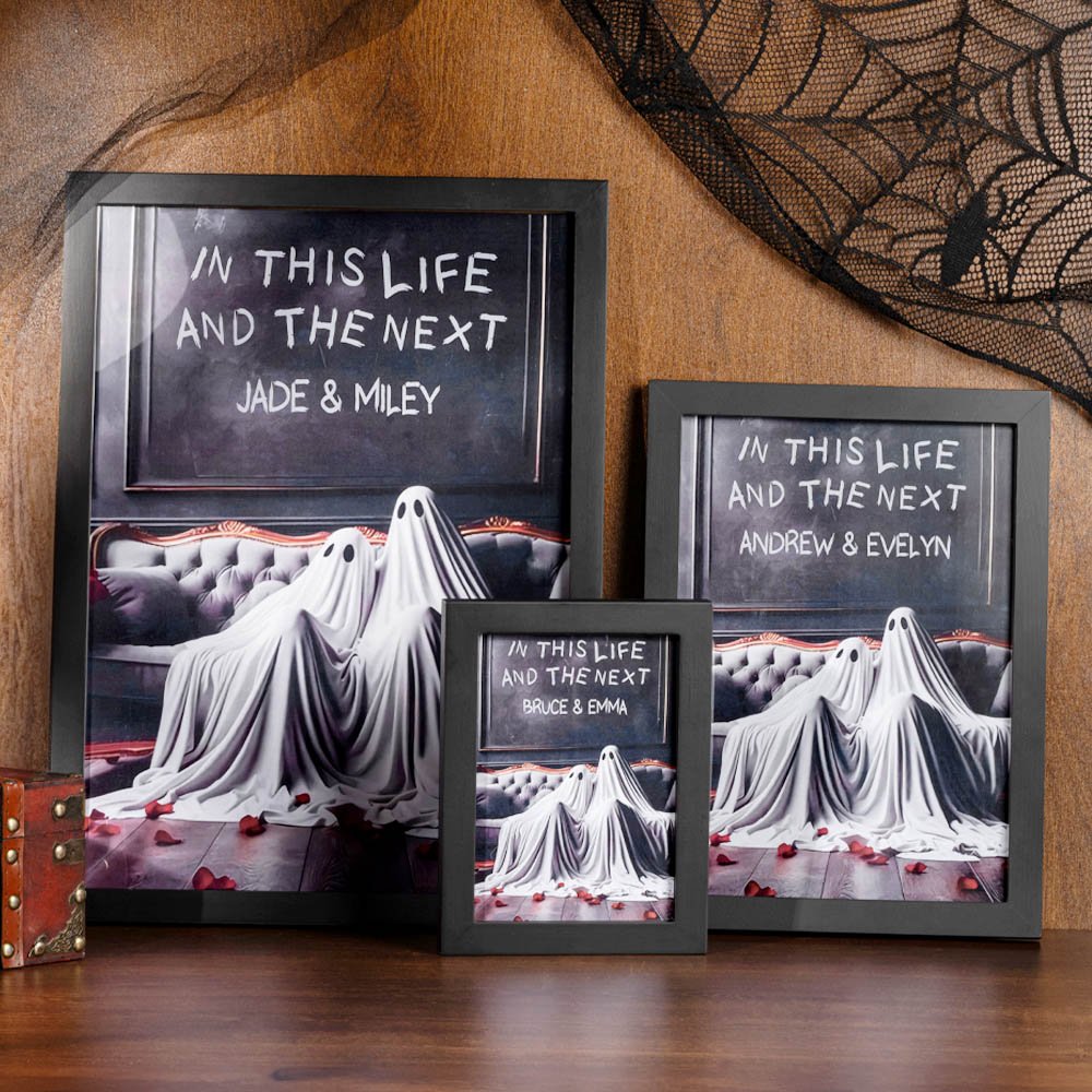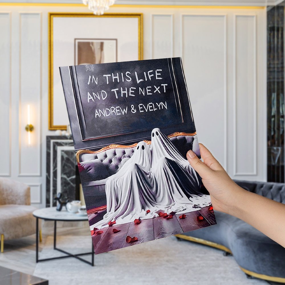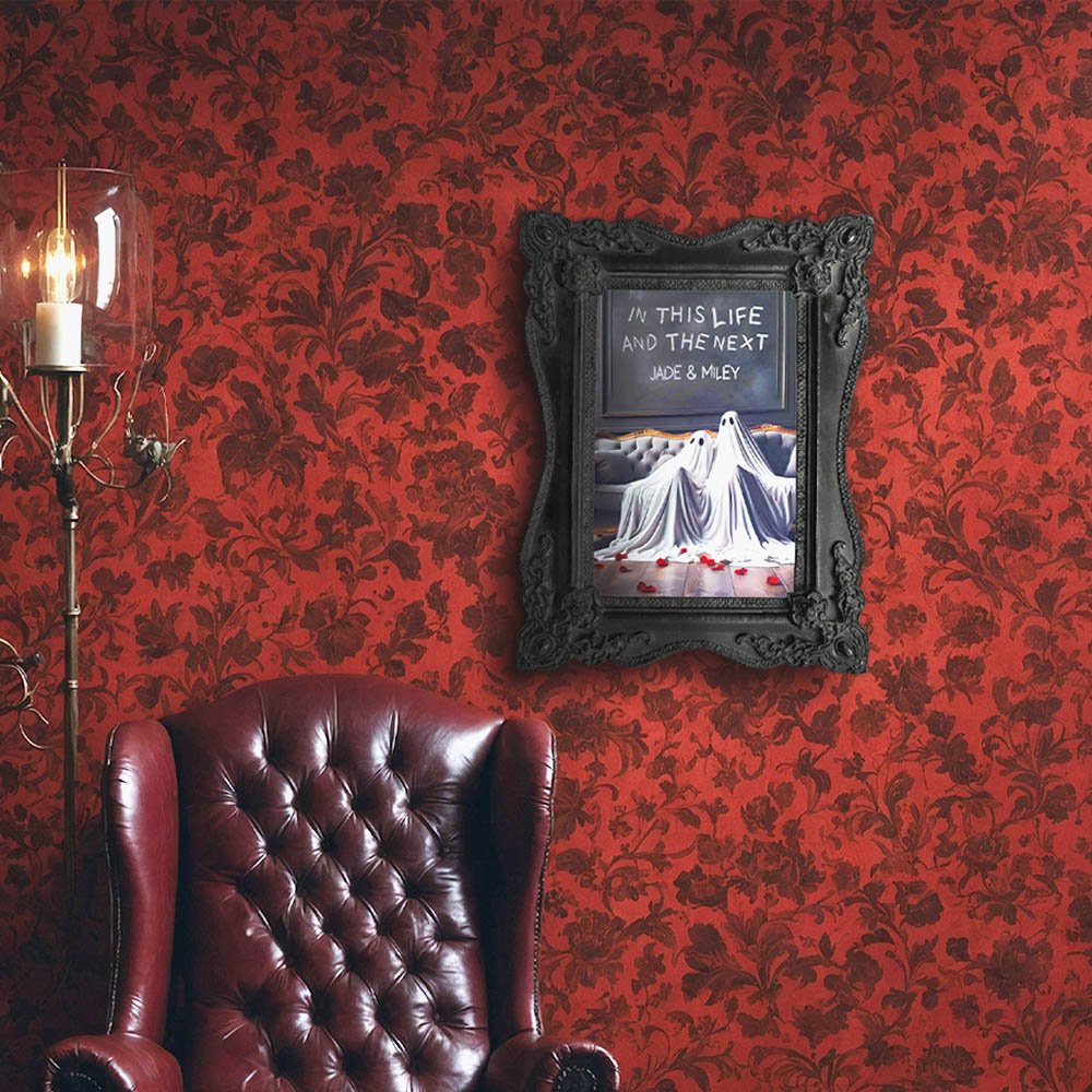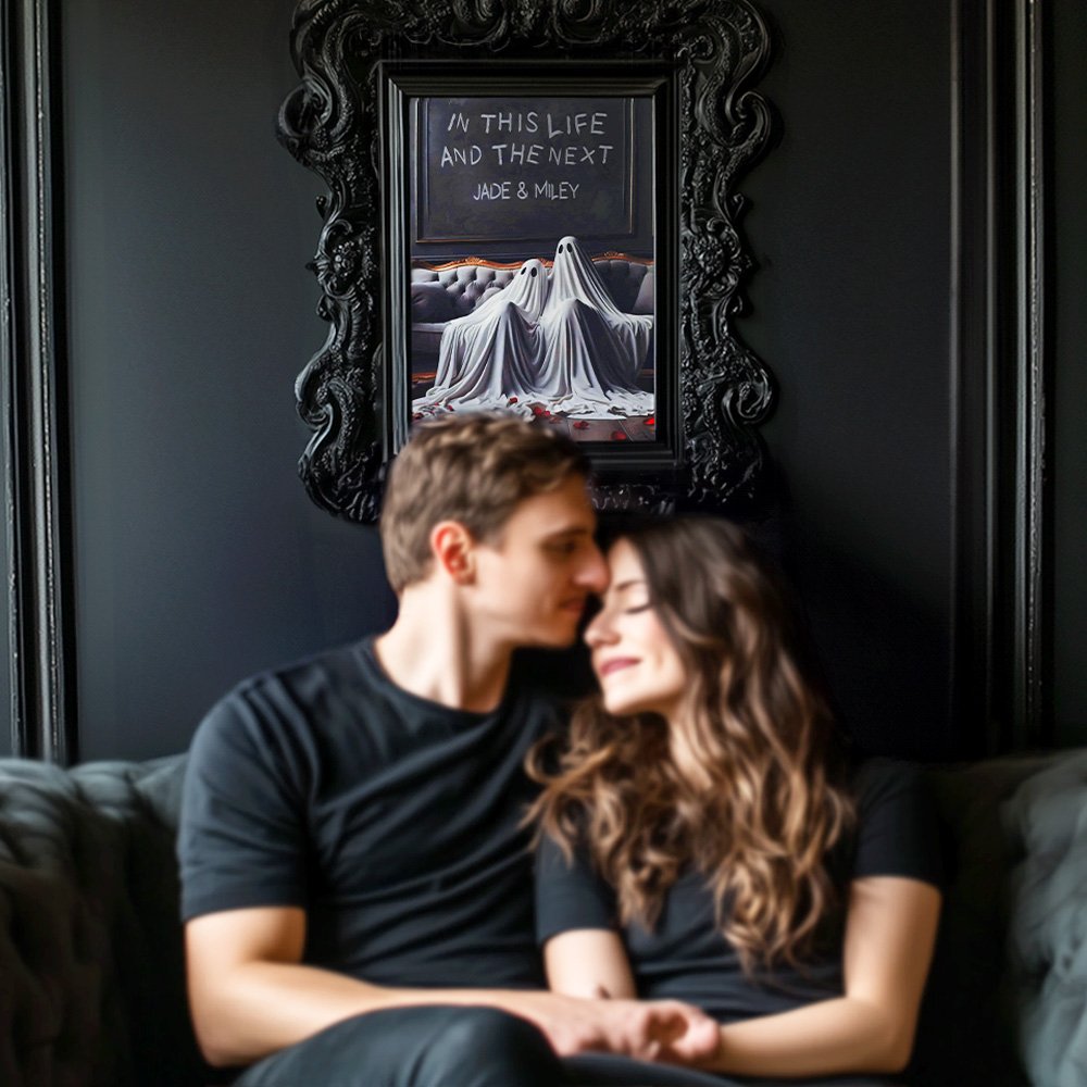 Our painting is a perfect dark romantic print. It features a ghostly couple cuddling on a couch surrounded by rose petals. Behind them is a huge "In This Life And The Next" sign, symbolizing love that lasts until death. You can add your and your significant other's names to it, making your love as eternal as a work of art.